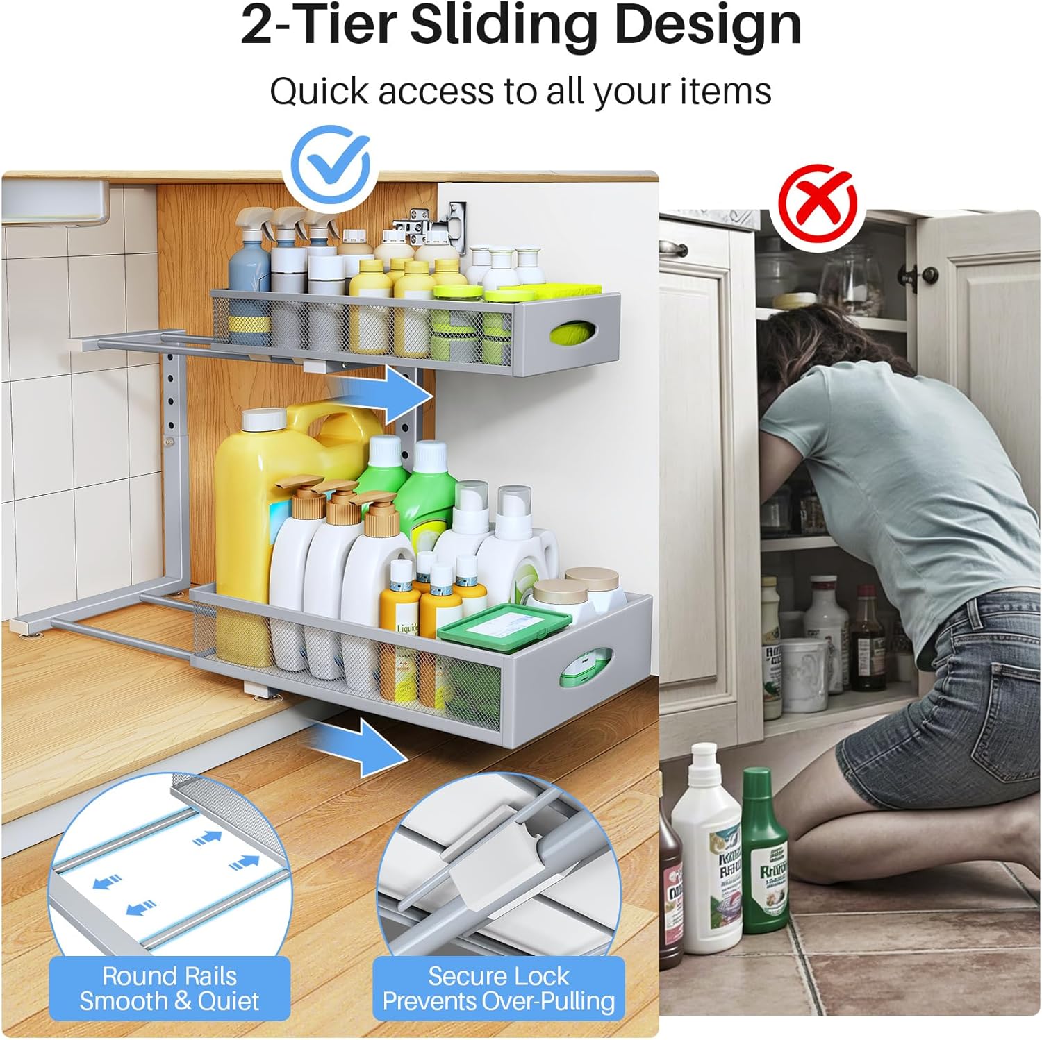 - 2-Tier Pull-Out Design for Easy Access: Both upper and lower drawers glide out effortlessly on smooth round rails—no noise, no jams. Easily access deep cabinet items without bending or kneeling. Ergonomic round handles ensure a comfortable pull, while the built-in lock prevents over-pulling.