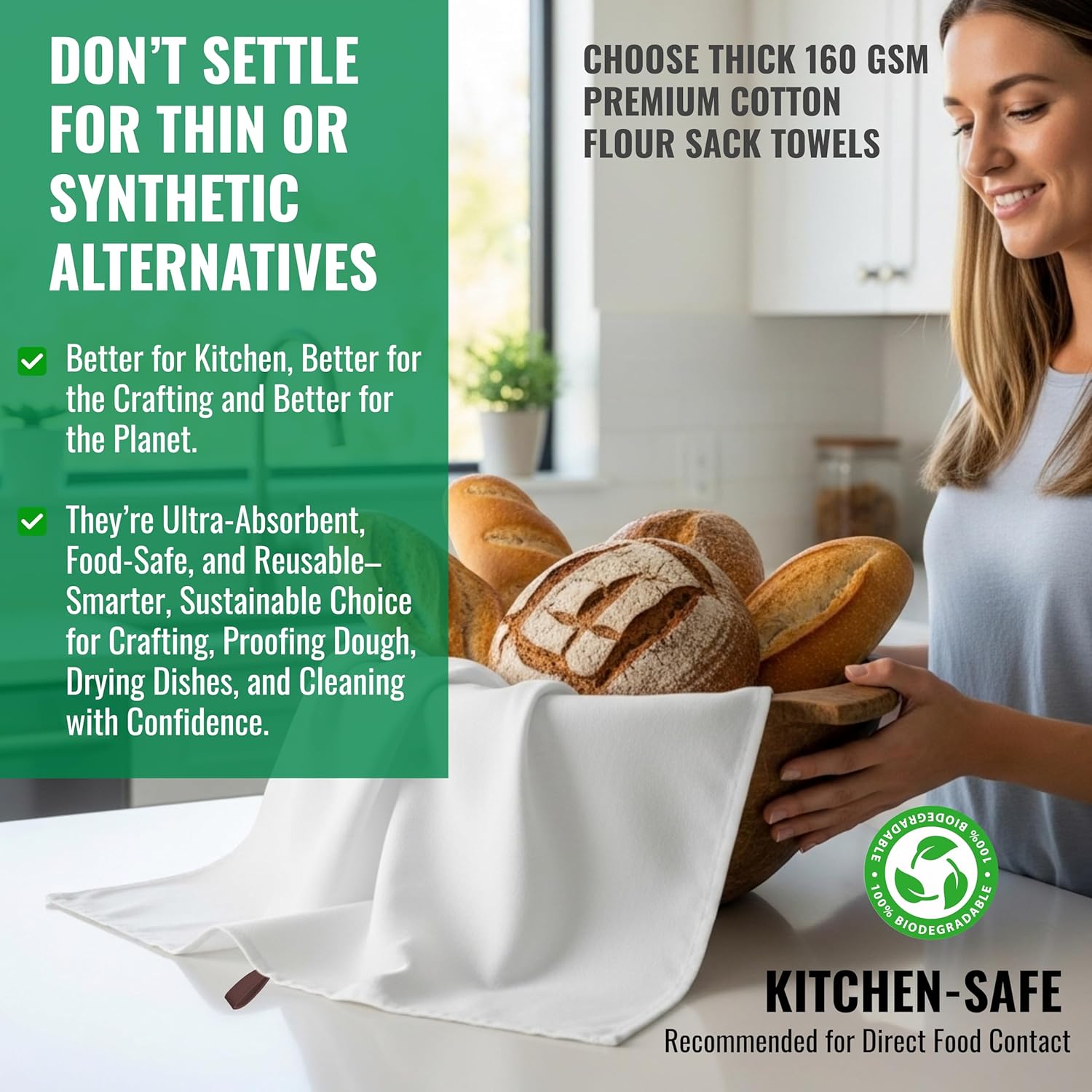 - High-Quality Cotton: Crafted from 100% pure cotton, these flour sack towels are thick, highly absorbent, and designed to dry quickly—perfect for everyday kitchen use.