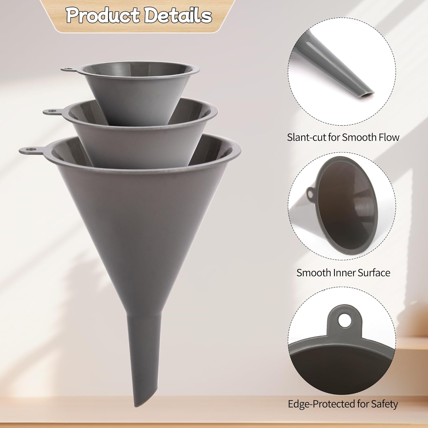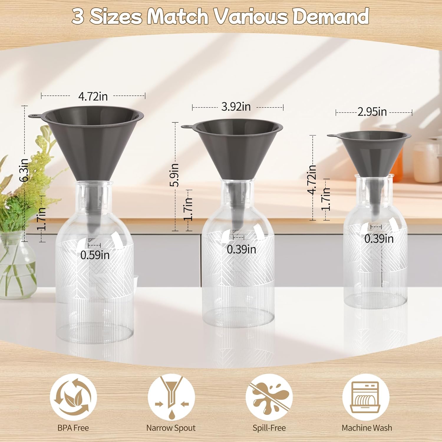 - ใ๐๐จ๐ฆ๐ฉ๐ฅ๐๐ญ๐ ๐๐๐ญ ๐๐จ๐ซ ๐๐ข๐ฏ๐๐ซ๐ฌ๐ ๐๐๐๐๐ฌใOur funnel set includes 3 different diameters (4.72inch, 3.92inch, 2.95inch) to meet a wide range of needs. Whether you're transferring liquids or powders, these funnels ensure precise and careful transfers for all your tasks. These kitchen funnels are perfect for filling bottles, jars, and containers, making them ideal for everyday use in the kitchen.