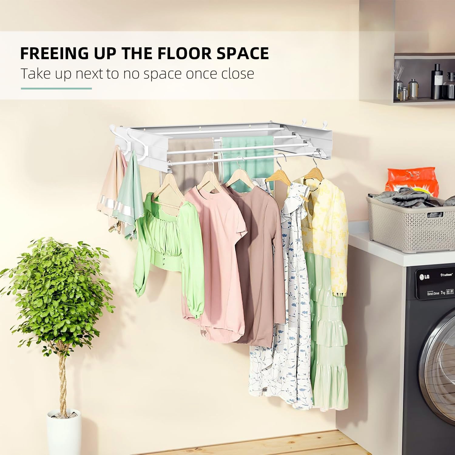 Laundry Drying Rack, Collapsible Wall Mounted Clothes Drying Rack - Foldable,Space Saving, 13.2 Linear Ft, 4 Aluminum Rods, 60 lb Capacity (White, 23.6" Wide)