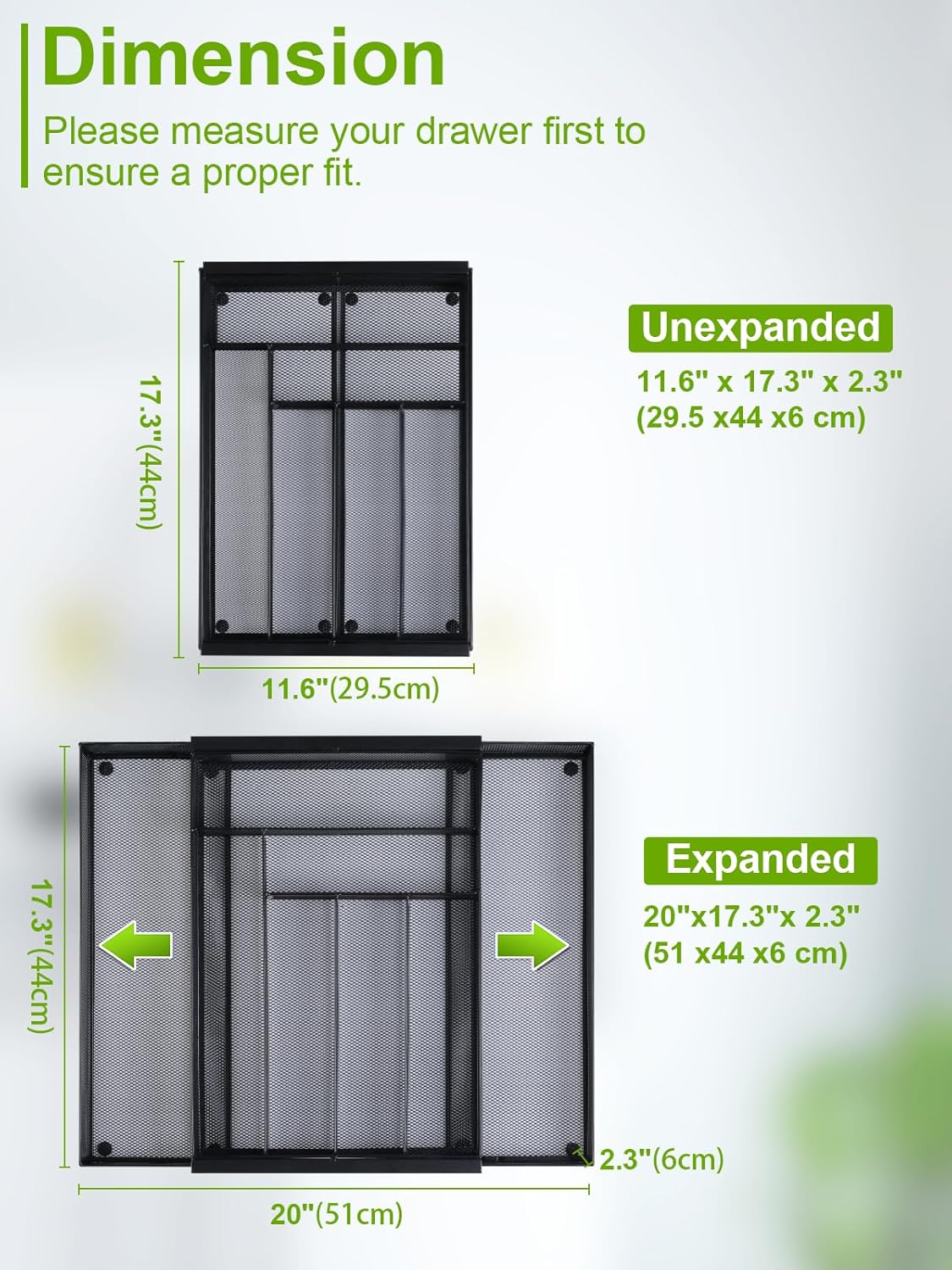 - Stay Organized:This Metal Silverware Organizer Features 7 Deep Compartments That Allow You to See Everything at a GlanceโNo More Clutter! The Space-Saving Design Helps You Find What You Need Quickly, Whether It's Your Favorite Knife or Spoon. Measure Your Drawer First! Minimum Drawer Size Need 11.7"*17.4โ.