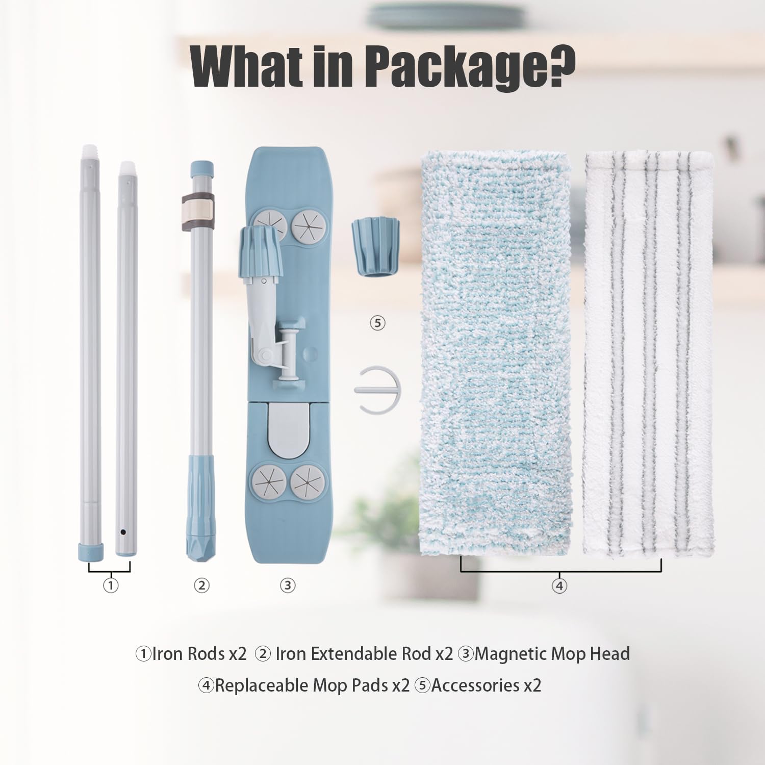 Dust Mop for Floor Cleaning,Magnetic Floor Flat Mop with 2 Washable Pads -Extendable 64‘’ Iron Handle for Hardwood Tile Marble Laminate Floors,Blue&Gray