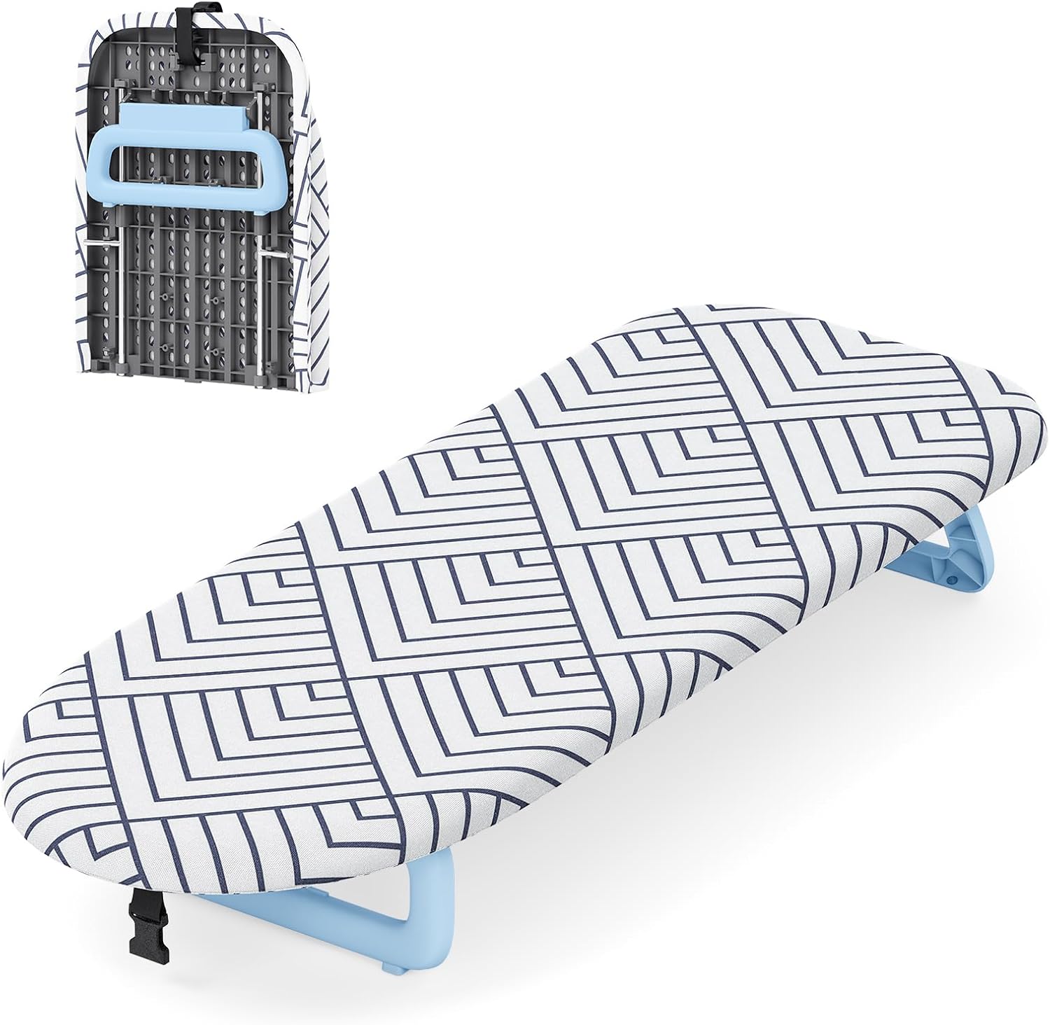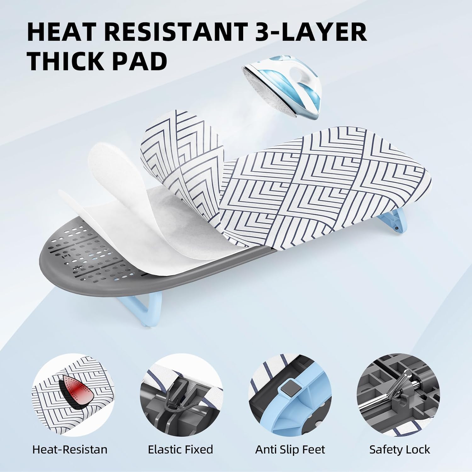 - [Detachable & Heat-Resistant Covers]Equipped with thick 100% cotton cover and soft felt padding, our mini ironing board ensures excellent ventilation and smooth ironing. The covers of this compact ironing board can be detached for easy cleaning.