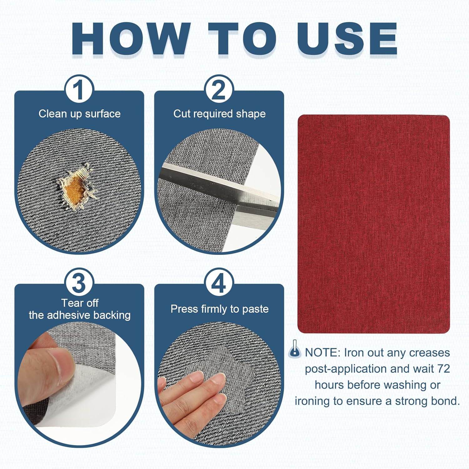 - Instruction: With the clothing patches for holes, customization is simple as you can cut it into any shape or pattern needed. Peel off the backing paper, apply it to the damaged area, focusing on corners and seams to prevent felting and curling.