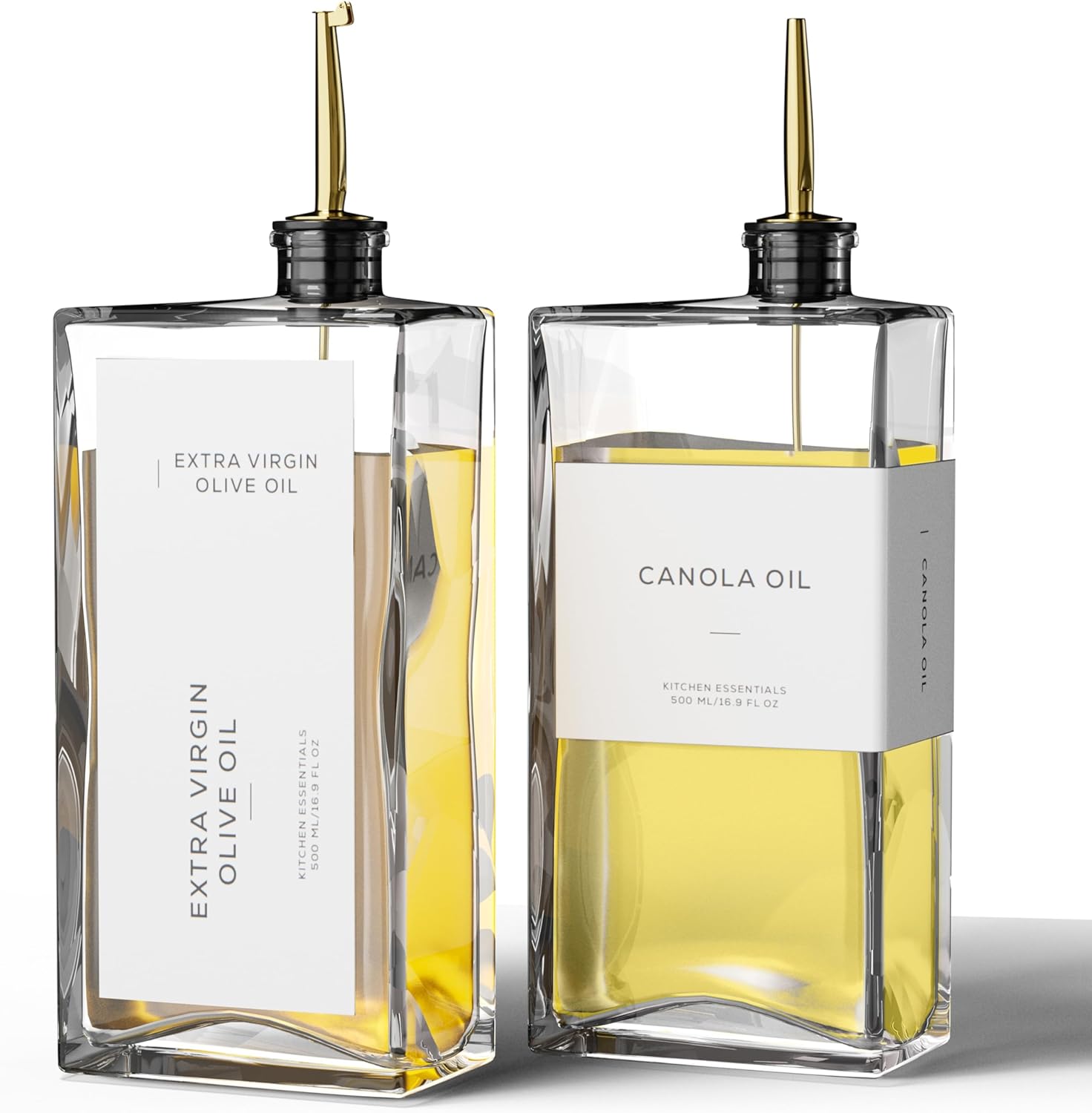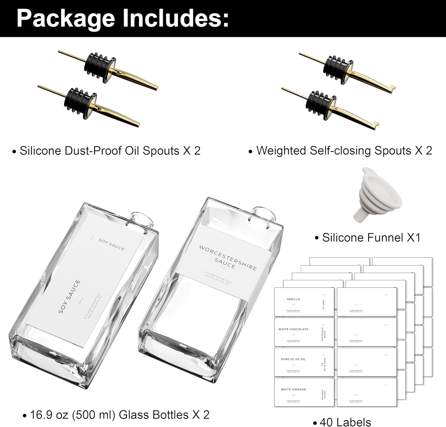 - Modern Kitchen Essential: Elegant and minimalist olive oil dispenser bottle include 2 high-quality 16.9 oz (500 ml) glass bottles, 2 weighted self-closing spouts, 2 Silicone Dust-Proof Oil Spouts, 1 funnel and a set of 40 labels, making them a must-have for any kitchen. Practical and decorative for your kitchen counter, these cooking oil dispenser meet all your kitchen needs for style and functionality!