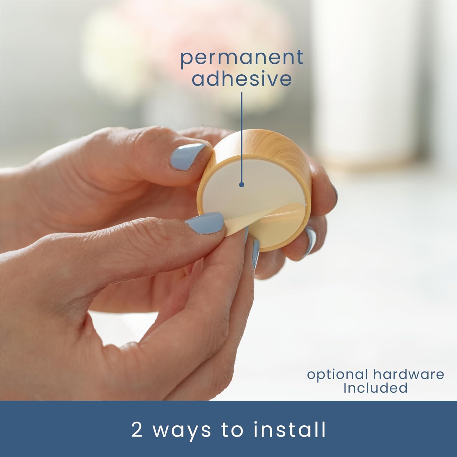 - Two options for installation β permanent adhesive backing for smooth surfaces or use the included hardware