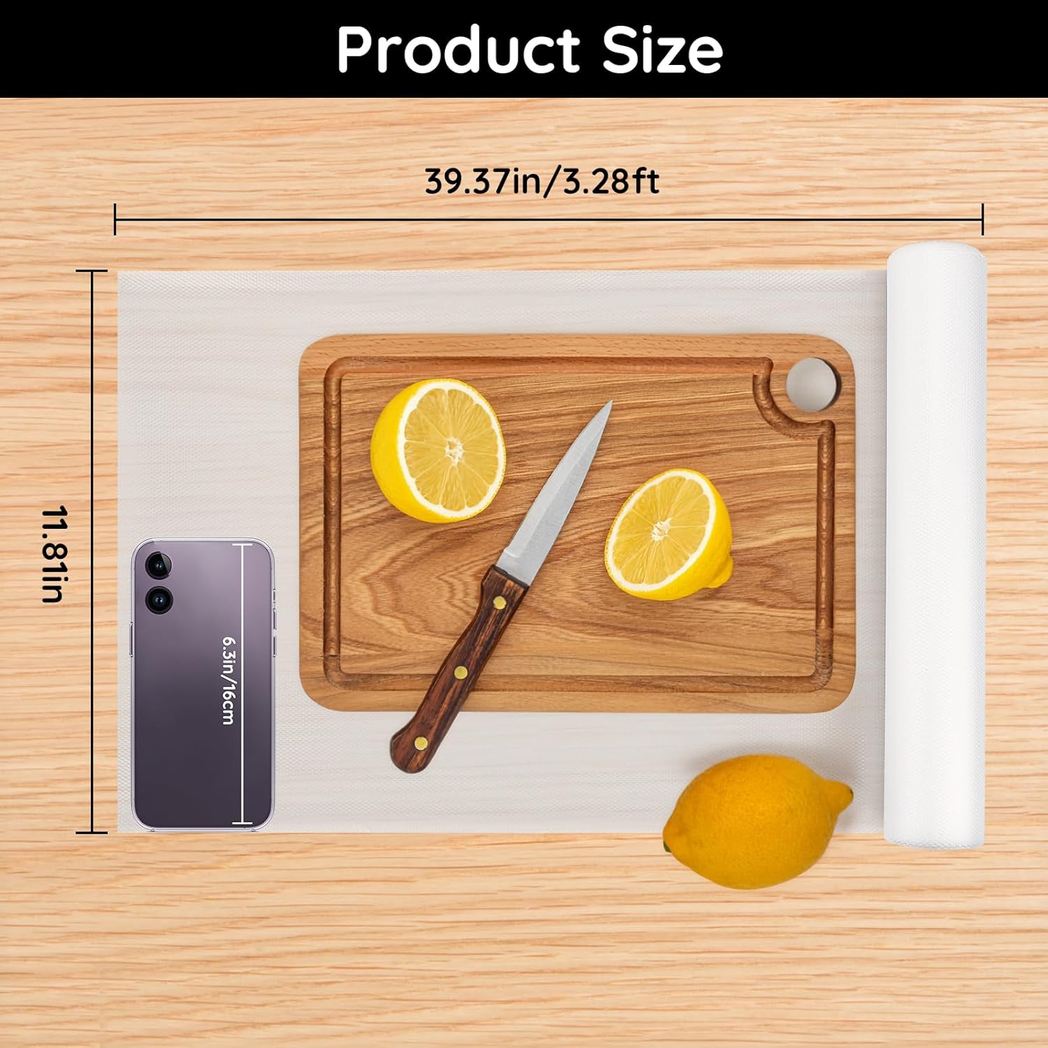 - ăEasy to TrimăSize: 11.81"W x 39.37"L x 0.02"T. The kitchen cabinet liner can be freely cut into different shapes with scissors. Customize it to fit unique drawer, cabinet, or shelf sizes, making it both practical and neat for your space.