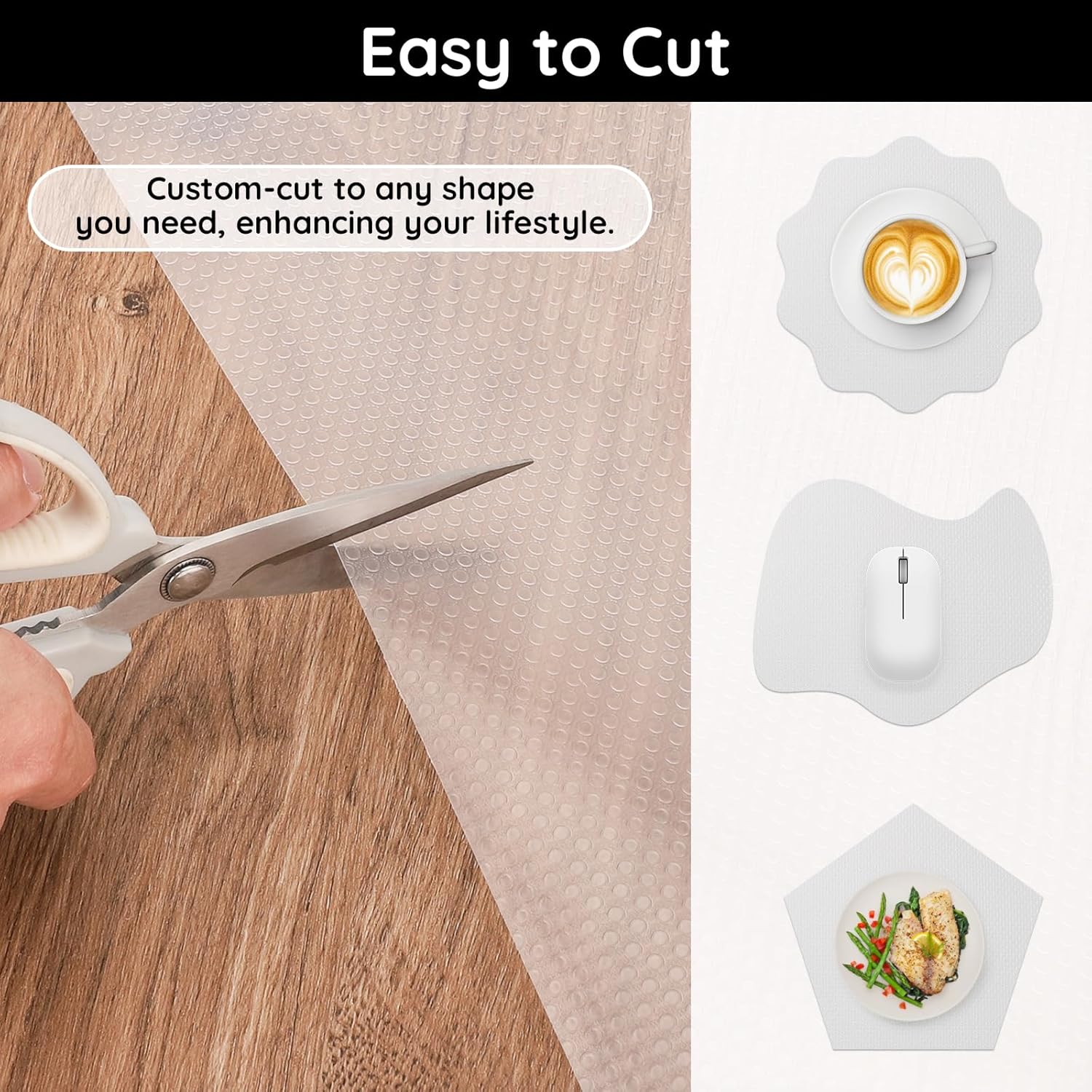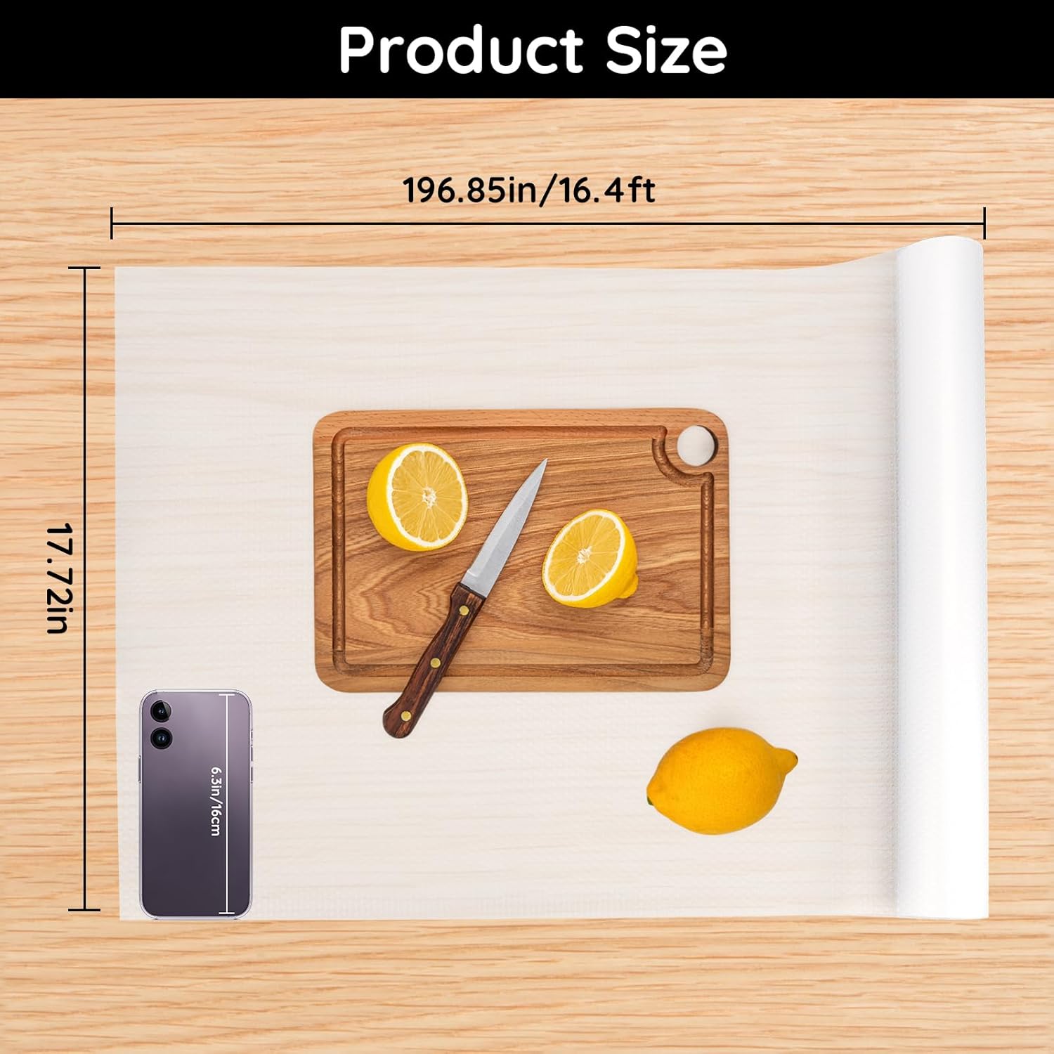 - ăEasy to TrimăSize: 17.72"W x 196.85"L x 0.03"T. The kitchen cabinet liner can be freely cut into different shapes with scissors. Customize it to fit unique drawer, cabinet, or shelf sizes, making it both practical and neat for your space.