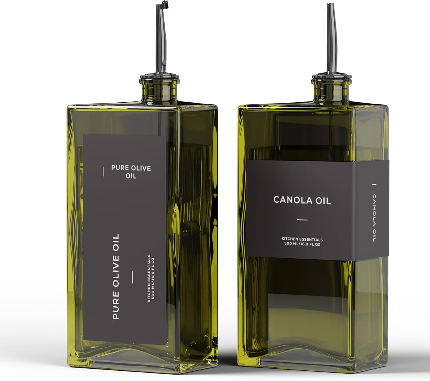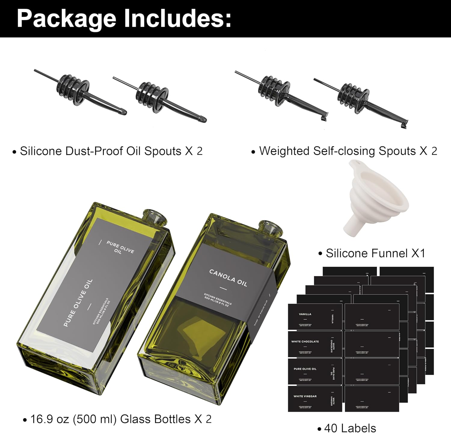 - Modern Kitchen Essential: Elegant and minimalist olive oil dispenser bottle include 2 high-quality 16.9 oz (500 ml) glass bottles, 2 weighted self-closing spouts, 2 Silicone Dust-Proof Oil Spouts, 1 funnel and a set of 40 labels, making them a must-have for any kitchen. Practical and decorative for your kitchen counter, these cooking oil dispenser meet all your kitchen needs for style and functionality!