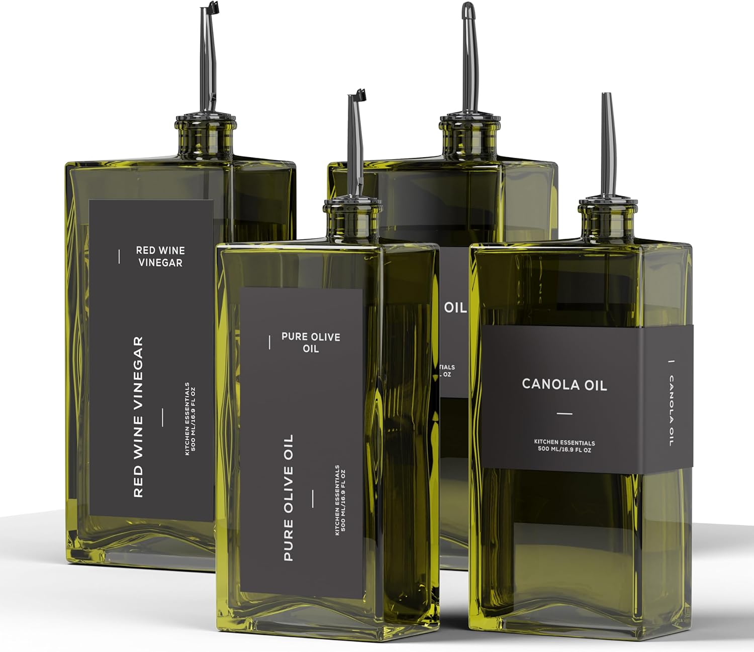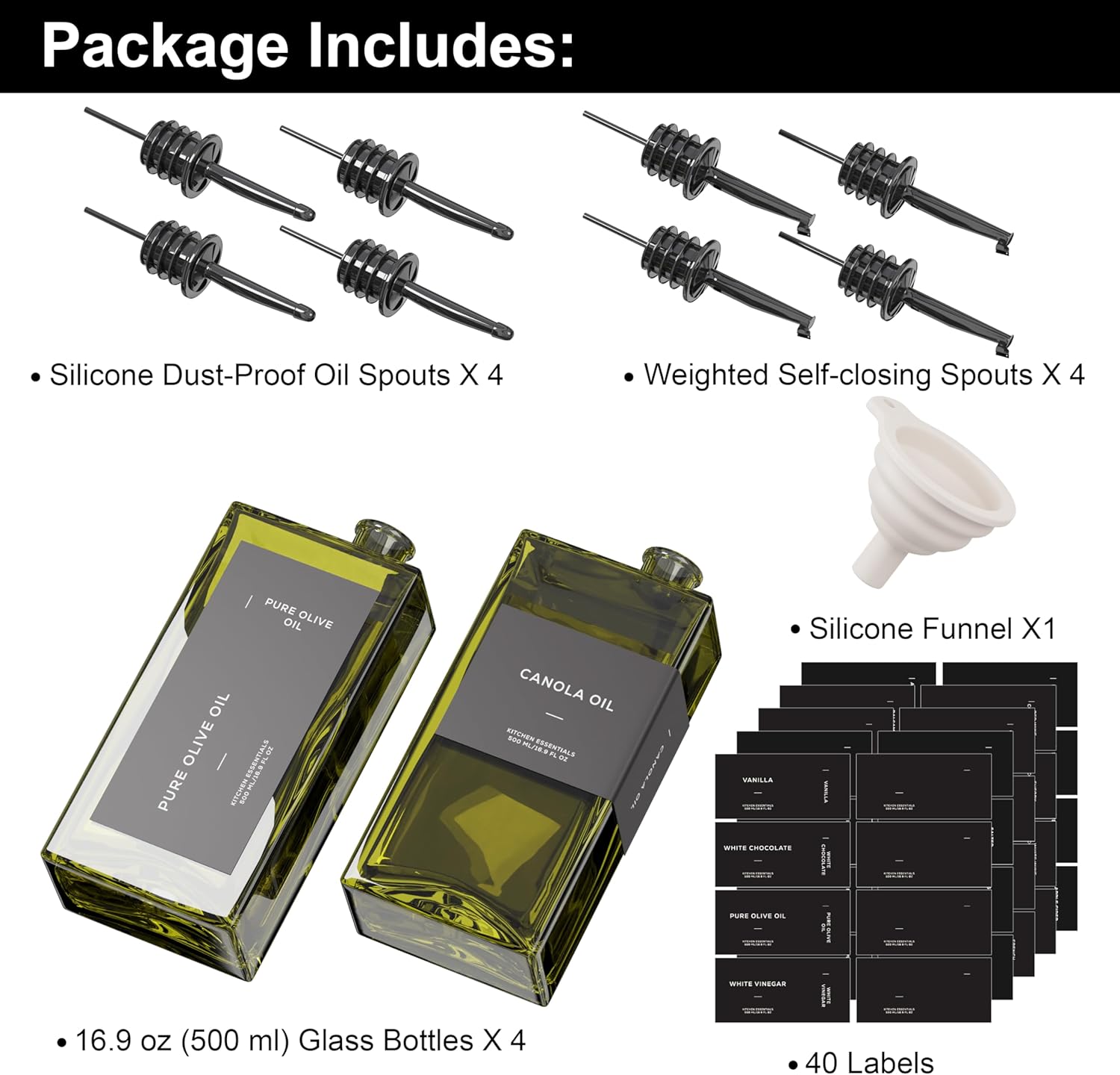 - Modern Kitchen Essential: Elegant and minimalist olive oil dispenser bottle include 4 high-quality 16.9 oz (500 ml) glass bottles, 4 weighted self-closing spouts, 4 Silicone Dust-Proof Oil Spouts, 1 funnel and a set of 40 labels, making them a must-have for any kitchen. Practical and decorative for your kitchen counter, these cooking oil dispenser meet all your kitchen needs for style and functionality!