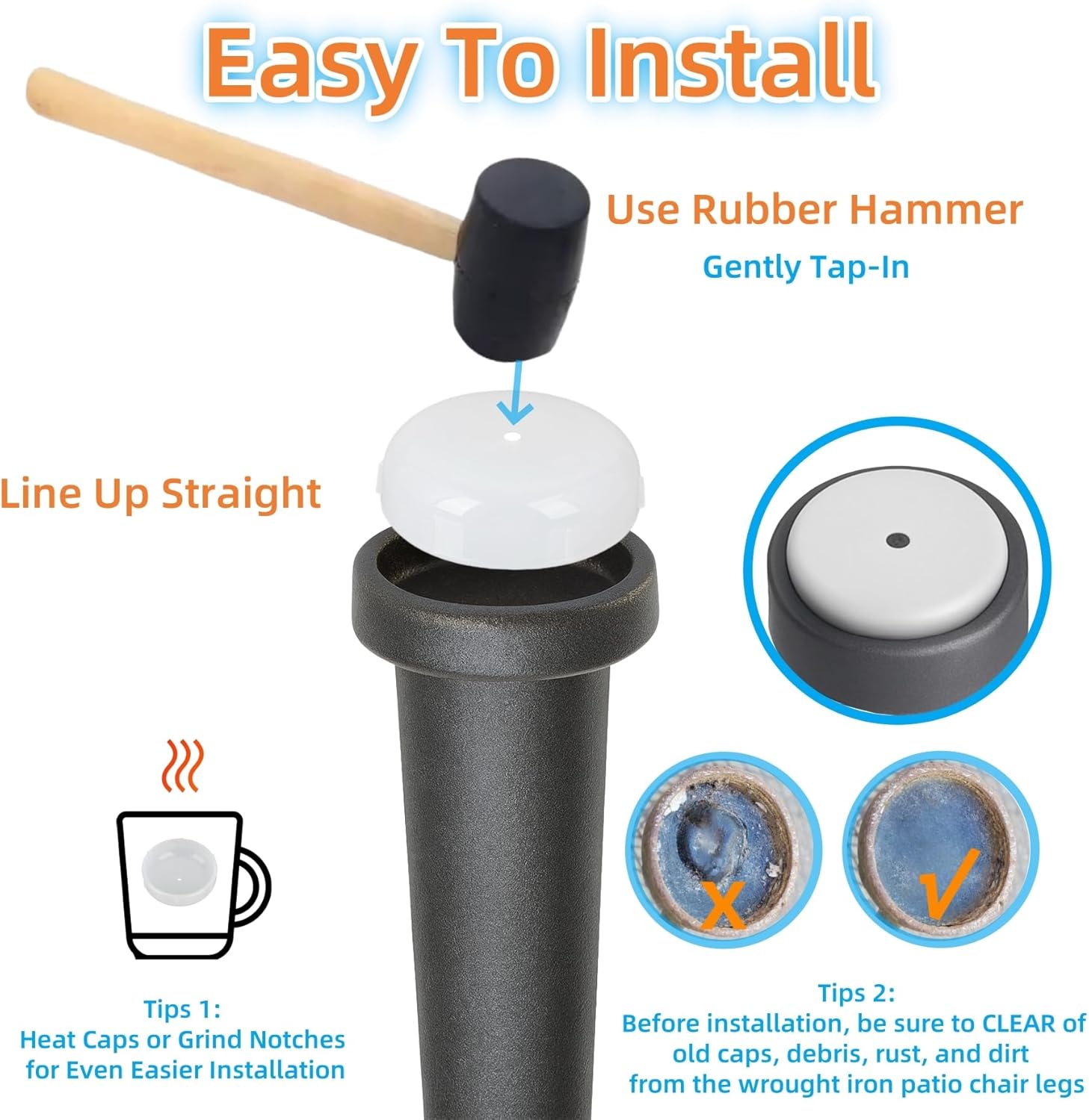 - Easy Installation, 24 Pack Value β Includes 24 patio chair feet caps for replacement glide caps of 6 chairs. Before installation, be sure to CLEAR of old caps, debris, rust, and dirt from the wrought iron patio chair legs, then tap the caps in with a rubber mallet. For even easier installation, heating the caps or grinding notches before fitting is recommended. These outdoor chair leg floor protectors provide lasting protection season after season.