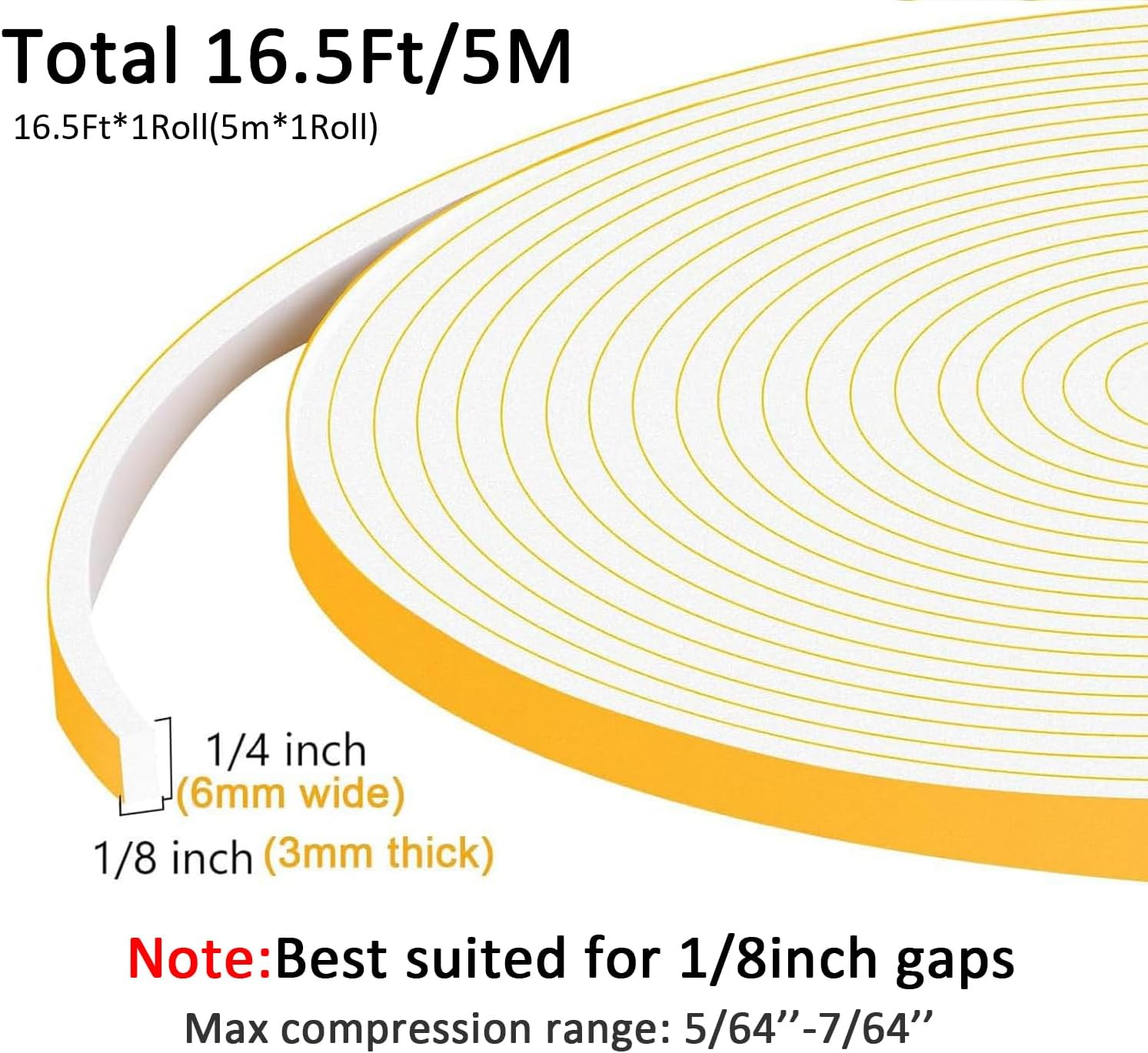 Weather Stripping Door Seal 1/4 inch Wide x 1/8 inch Thick Foam Insulation Door Seal Strip for Door Frame,Lightproof, Total 16.5Feet (16.5Ft x 1 Roll)