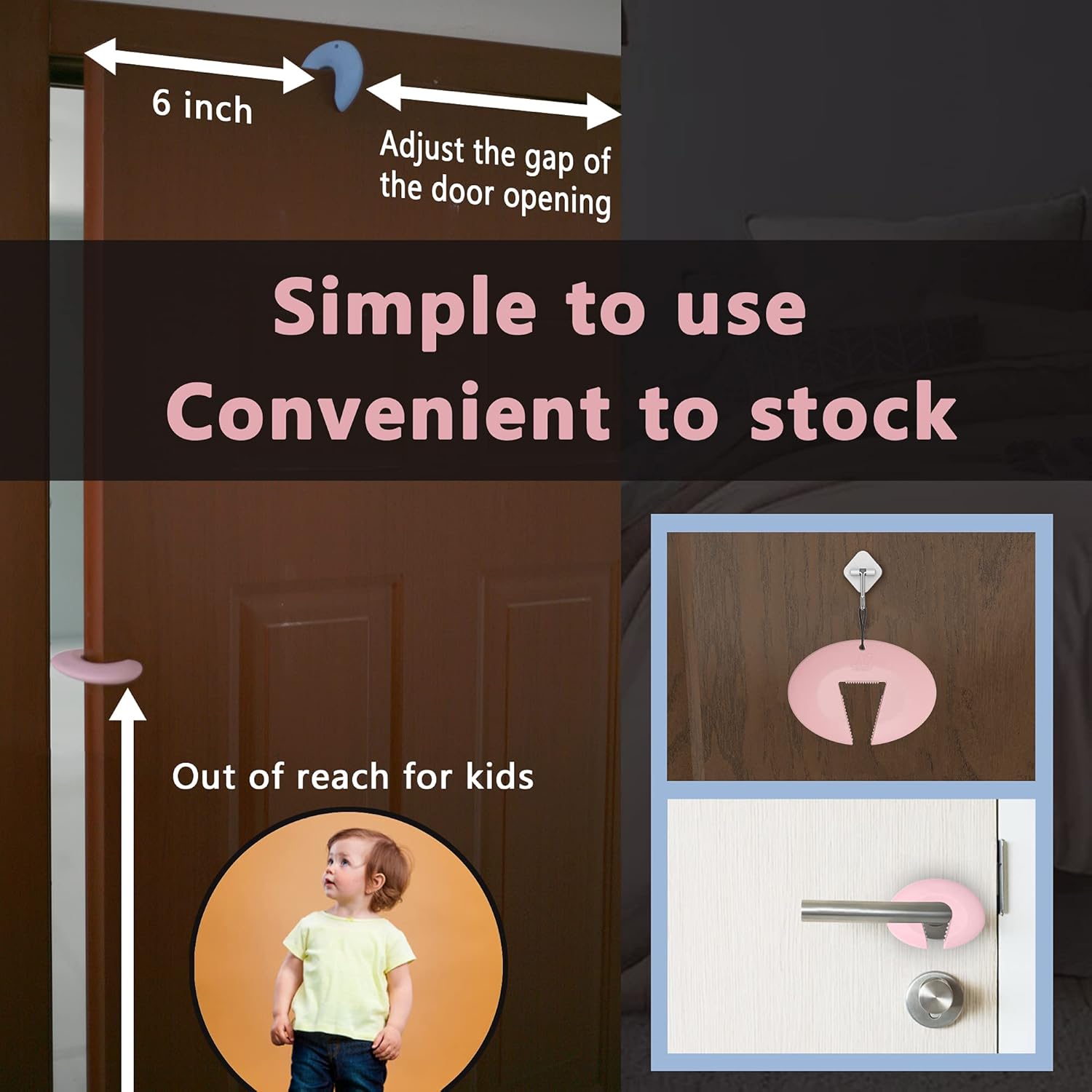 - Intelligent Design Toddler Door Stopper: Flexible C Shape makes it easy to attach and fits around any size door. The door slam stopper Innovative 'teeth' make the pinch guard and door combination more stable, therefore it will not fall off even with a strong slam.