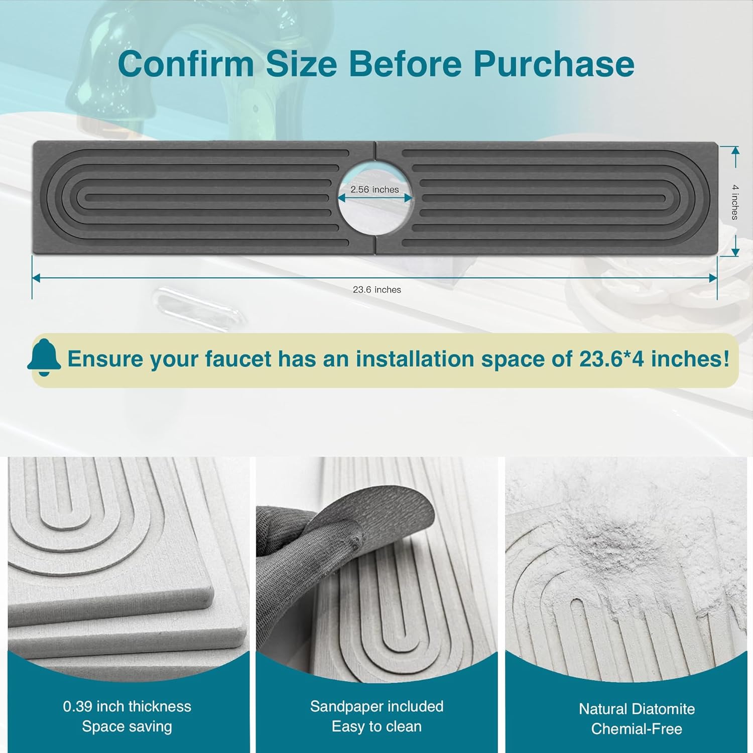 - Drying Fast: Our Faucet mat for kitchen sink is crafted from natural diatomacues earth. The diatomite stone's small holes enable amazing water absorption, quickly soaking up splashes and self-drying within minutes. Say goodbye to annoying drips and keep everything dry.