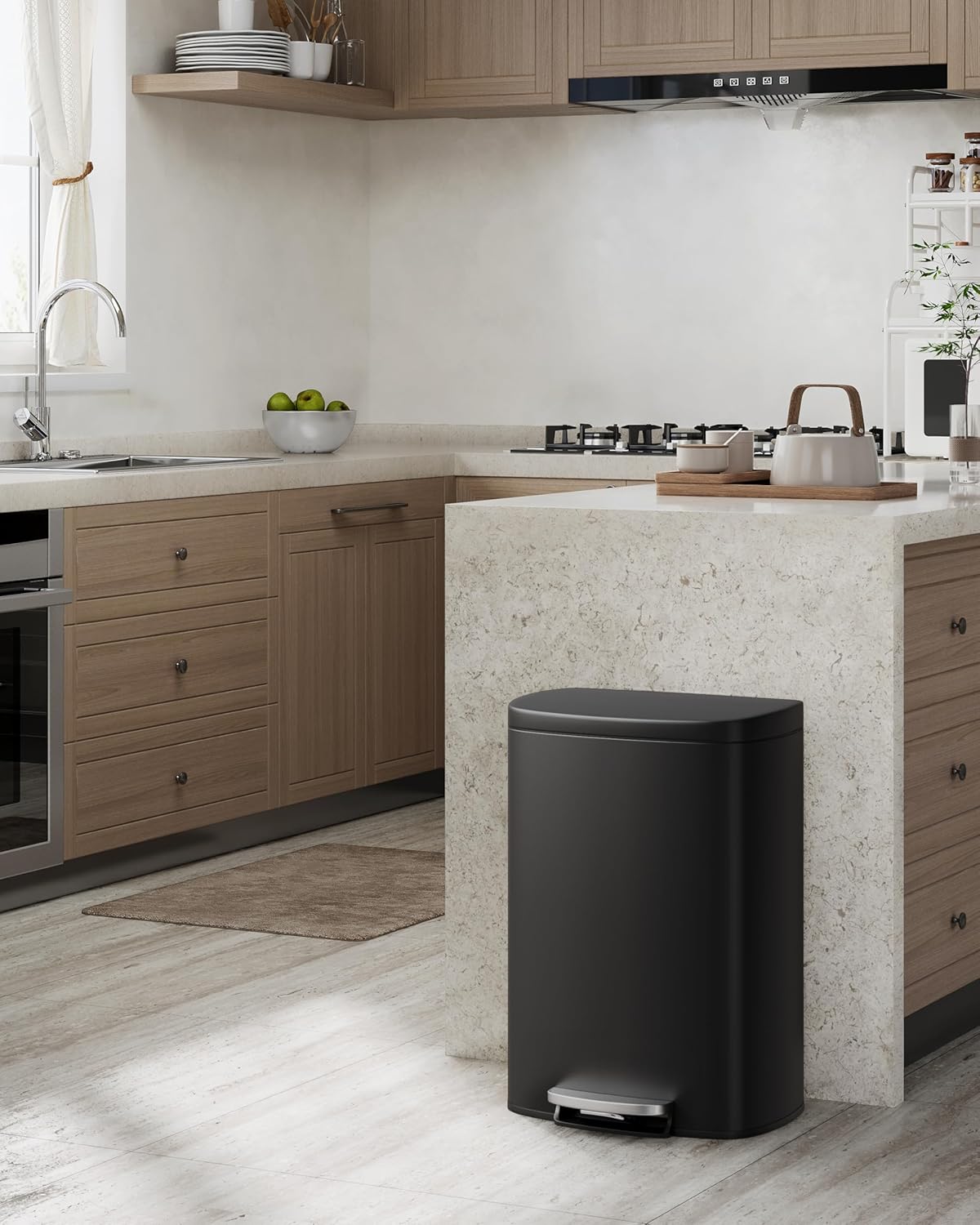 - [MINIMAL FORM, EXQUISITE DETAIL] – The Garvee powder coated metal kitchen trash can boasts a fingerprint-resistant finish that wipes clean in seconds. The thick lid with extended overhang lip conceals bag edges for a seamless profile, while anti-slip rubber feet keep the bin firmly in place on tile, hardwood, or low-pile carpet