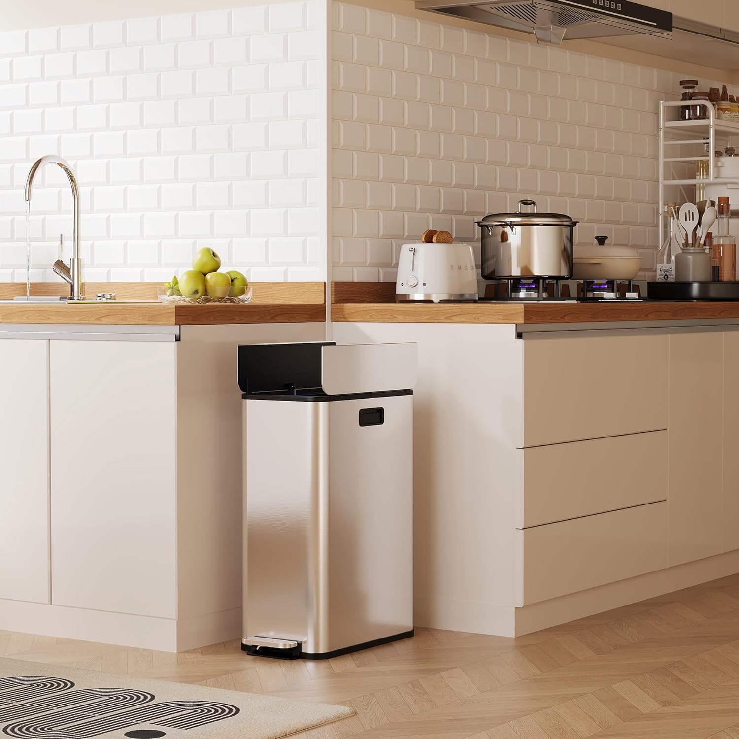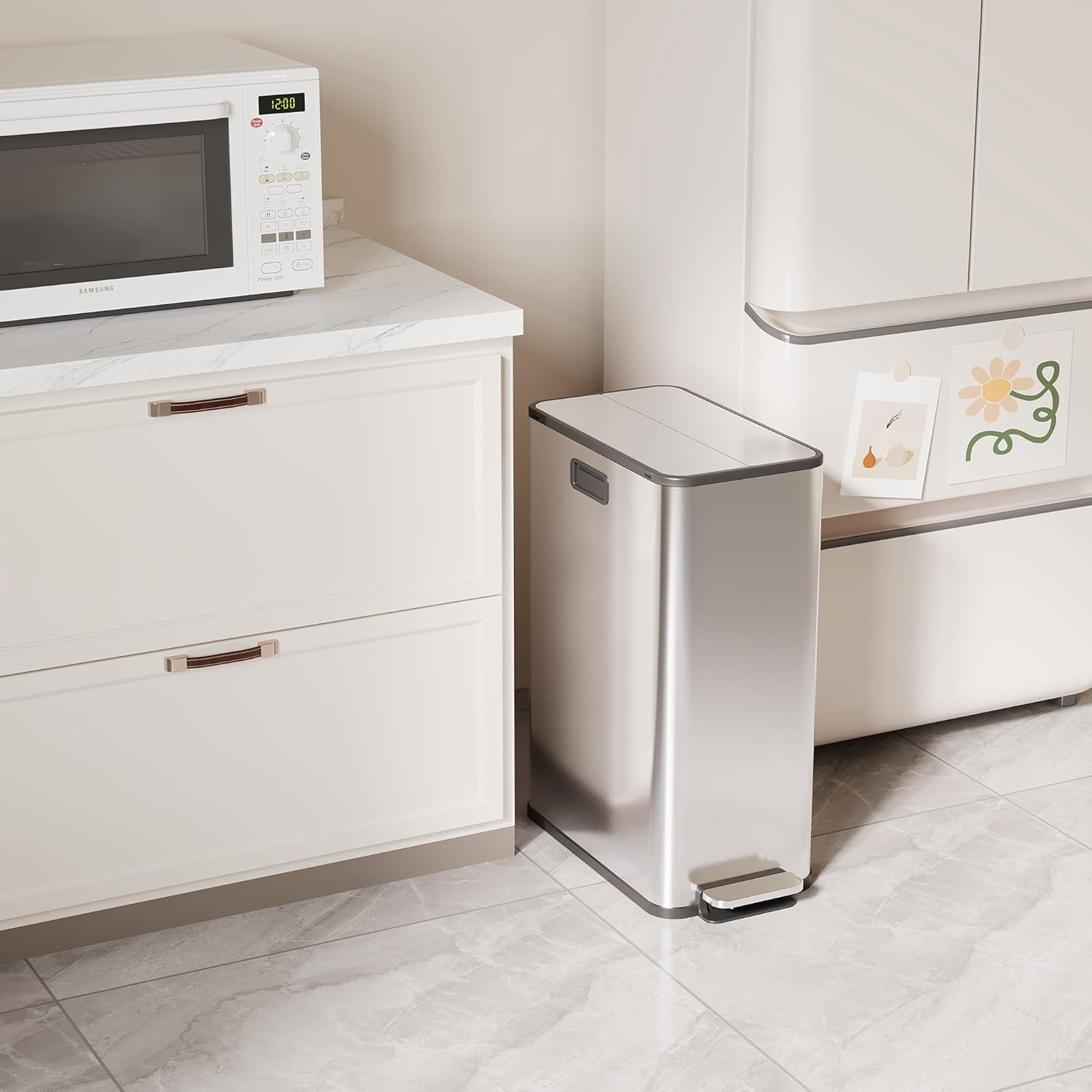 - Durable and Pet-Proof: Crafted from premium stainless steel, this dual compartment trash bin is built for long-term use. Its robust pedal and fully-sealed lid make it challenging for pets to manipulate, ensuring your waste stays secure