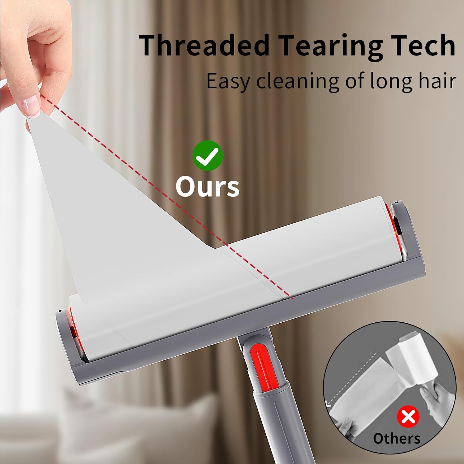 - Pragmatic Threaded Tear-off Design:Experience effortless cleaning of long hair with the pet hair remover sticky roller's threaded spiral design. Removing the top layer is a breeze - just lift and pull from the side of the large roller refill. The stick-it roller glides smoothly from one side to the other, featuring clear lines on the adhesive tape, ensuring easy identification of the cutting edge on the lint roller stick long handle while in use