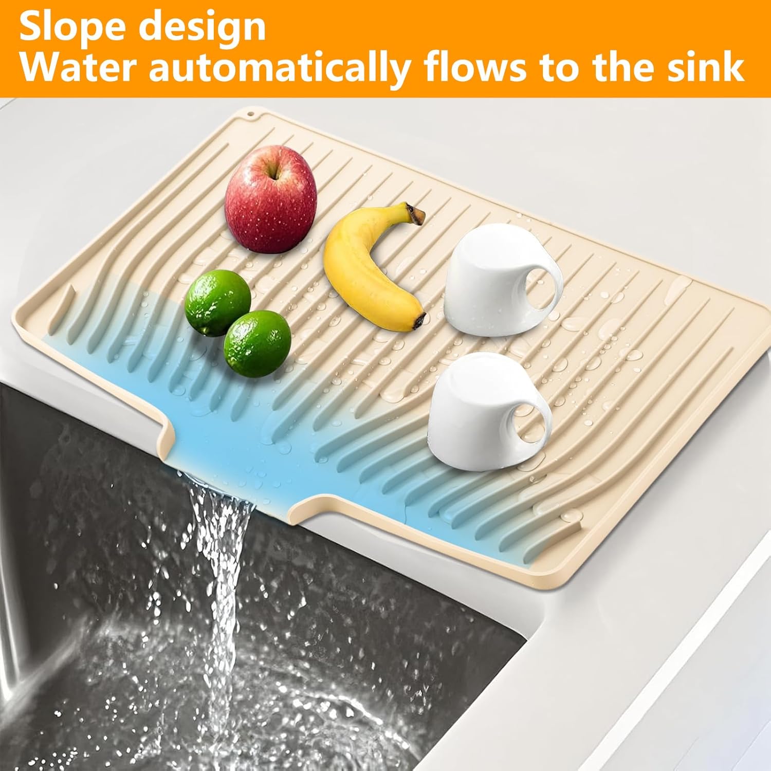 - Fast Drying: Silicone dish drying mats are designed with raised stripes to increase air circulation, which speeds up the drying process and allows your utensils to dry faster. The specially designed edges allow water to drain directly into the sink. This keeps your countertops dry
