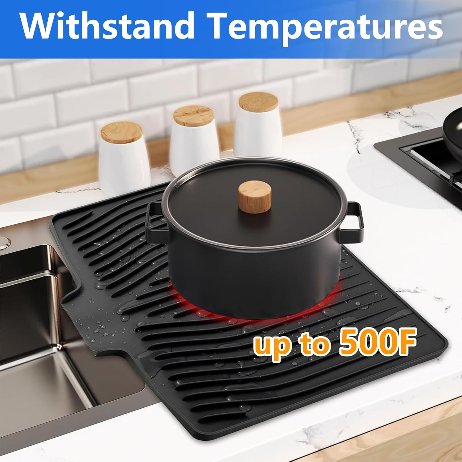 - Anti-Slip and Heat-Resistant: This kitchen counter Drying mat has excellent anti-slip effect to keep dishes, glassware, vegetables, fruits stable. It is also heat resistant up to 450°F (230°C) and can be used as a countertop heat resistant mat