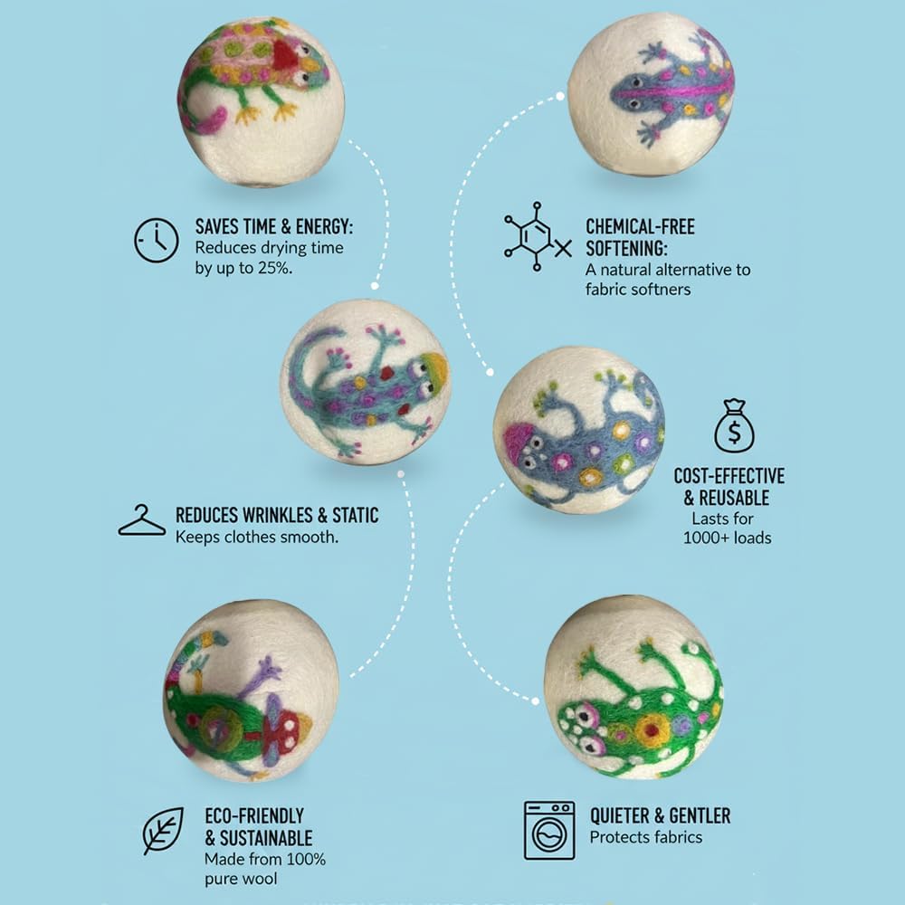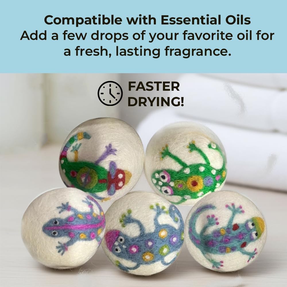 Ezhippie Quality Wool Dryer Balls - 6 XL Lizard Pack - 1000+ Loads - Pure Organic Wool - Reusable Natural Fabric Softener Perfect with Essential Oils, Reduce Clothing Static and Wrinkles