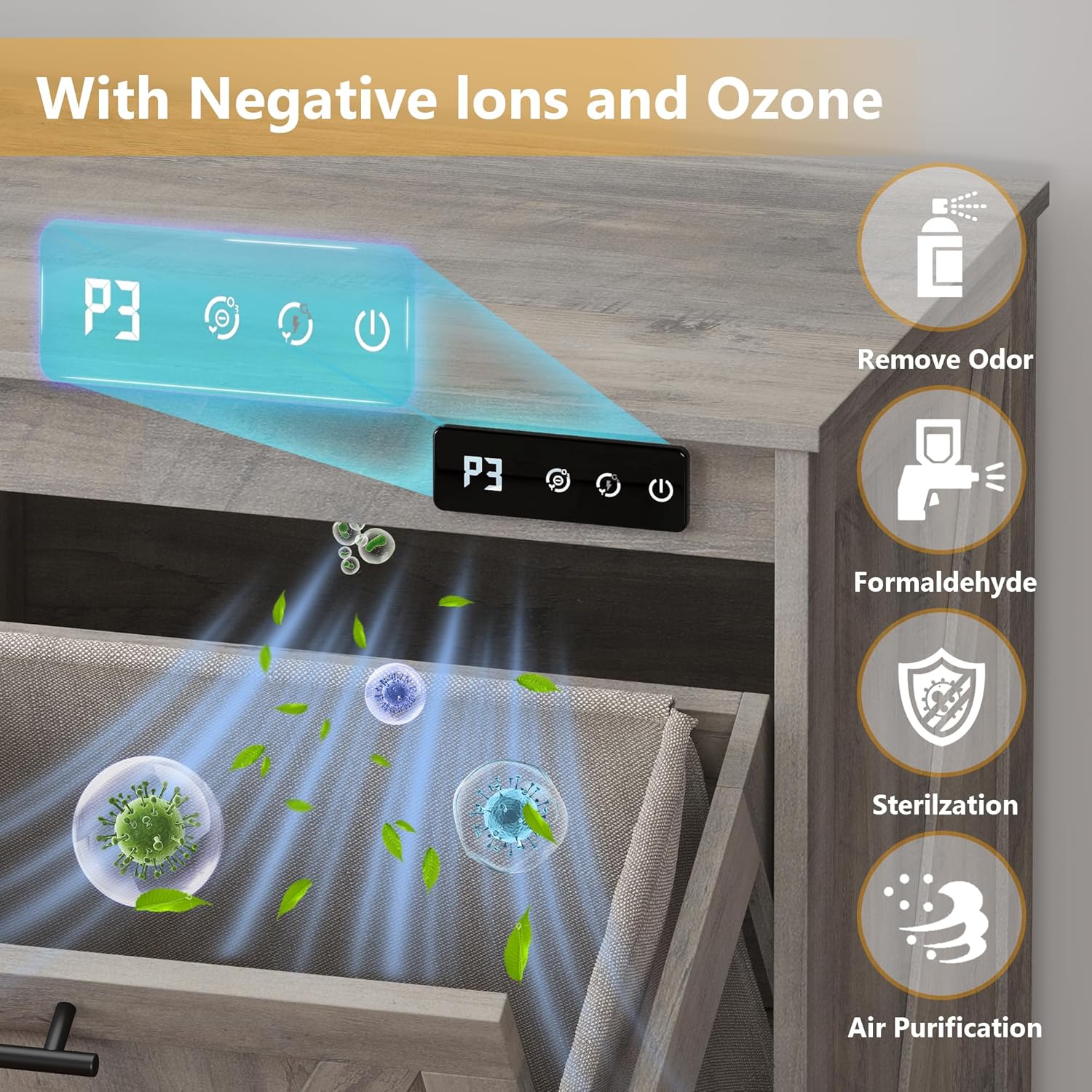 Tilt Out Trash Can Cabinet for 2 Bins, Hidden Recycle Garbage Bin Enclosure, Wooden Double Laundry Cabinet with Odor Control, Negative Ion & Ozone, for Kitchen, Bathroom, Laundry Room