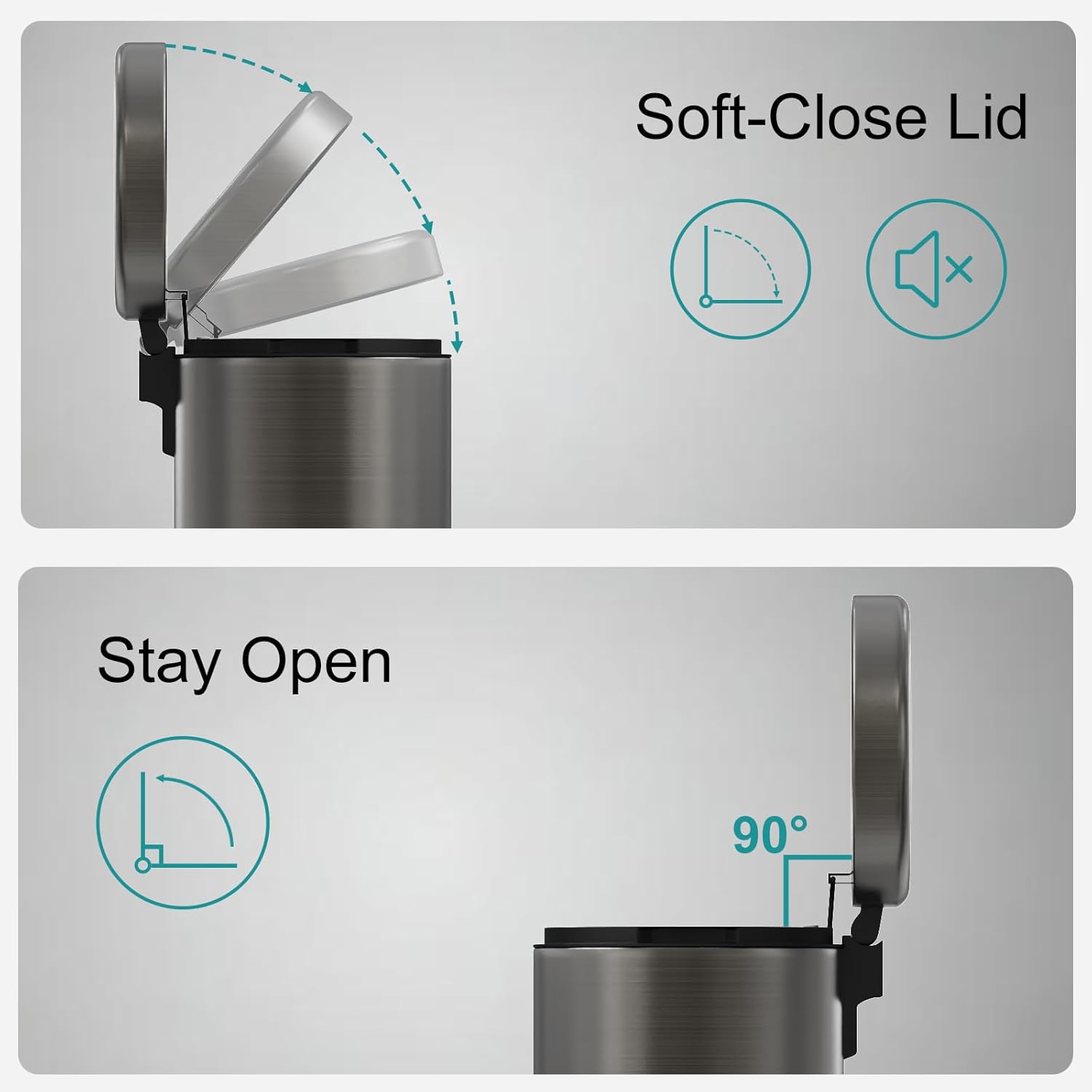 - ă Silent-Close LidăNo more loud slams! The whisper-quiet, soft-closing lid is perfect for kitchens or offices. It stays open at 90° for hands-free use and locks odors inside.