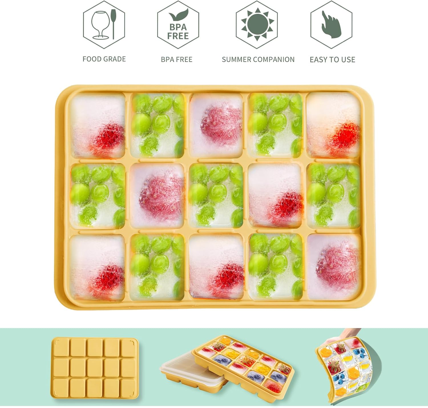Tvmania Ice Cube Trays Set of 2, Easy Release 15 Flexible Silicone Ice Cube Molds with Removable Lid Reusable Freezer Ice Trays Stackable for Whiskey, Baby Food, BPA Free (yellow)