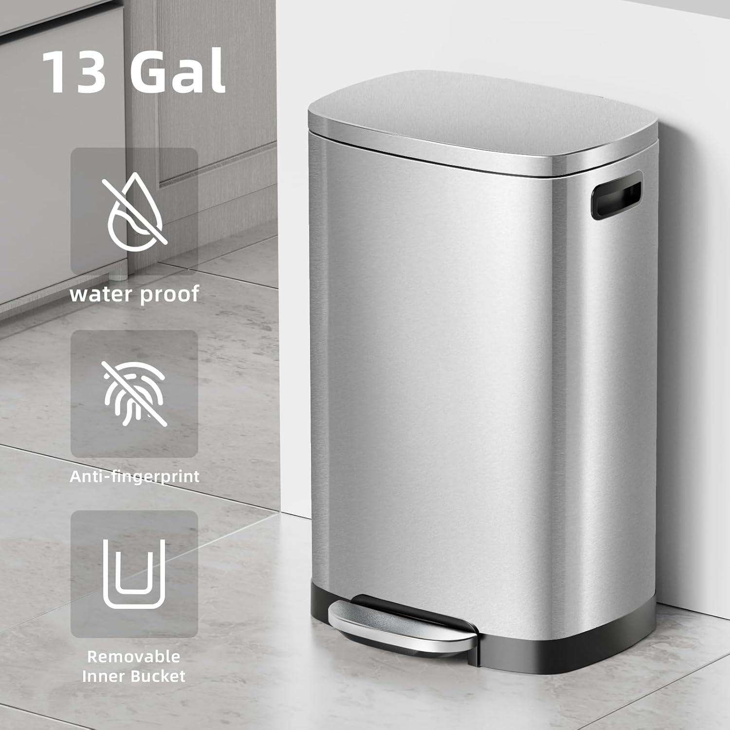 - đźš® Large Capacity & Odor Lock Technology: 50L (13 Gallon) extra-large capacity reduces frequent trash runs, perfect for busy kitchens. Sealed lid with odor-blocking design traps smells, keeping your space fresh and clean.