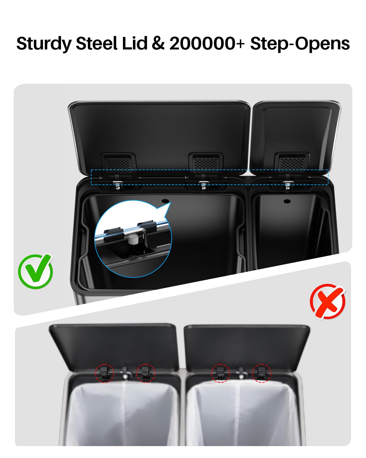 - Whisper-quiet Closing & Removable Inner Buckets: The dual trash and recycle bins for kitchen feature a soft-close mechanism that allows the lid to close gently, slowly, and silently. Premium plastic inner buckets with twin carry handles are easy to lift, eliminate trash bag leaks, and keep the kitchen trash can clean