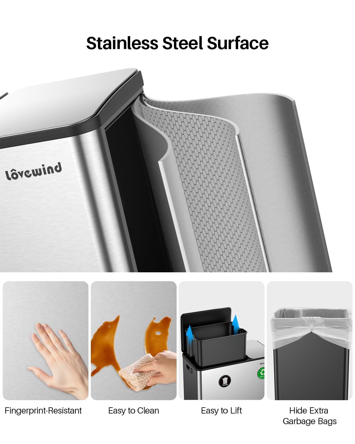 - Stainless Steel Construction: Lovewind double trash can is made of high-quality stainless steel, which is durable, easy to clean, and anti-fingerprint, making it an ideal choice for your kitchen