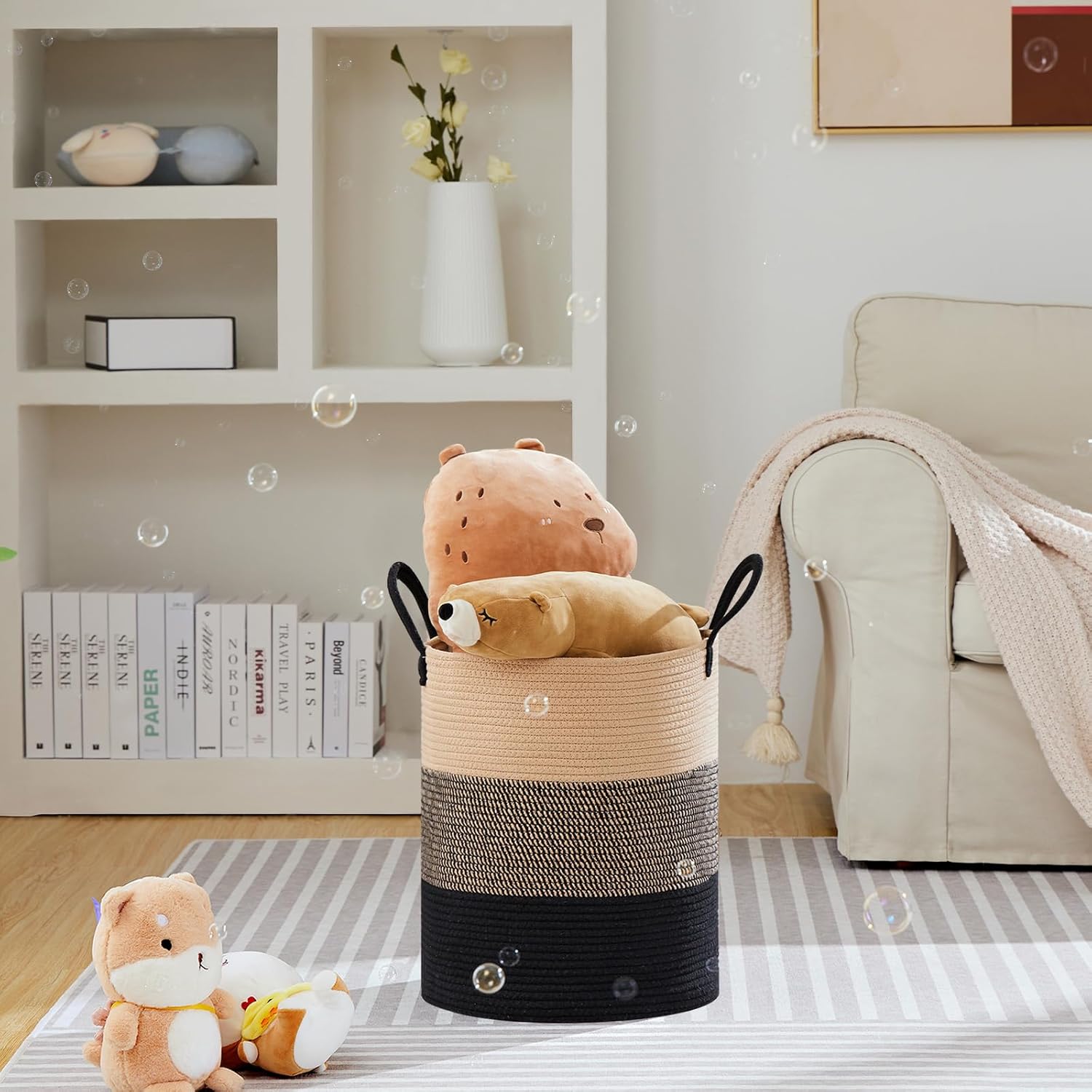 - ❤【Simple & Versatile】 This large decorative basket showcases an aesthetic with its minimalist lines and pops of color. It can be used in different scenarios, such as living room, laundry room, bedroom, bathroom, college dorm, nursery room and so on.