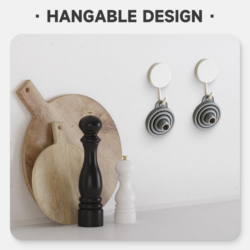 - ✨ Collapsible & Space-Saving Design: Say goodbye to cluttered storage! Each funnel features a flexible, retractable design—ready to use when expanded, and collapses to an ultra-thin 2-3cm thickness for storage. When stacked, the three sizes take up no more space than the palm of your hand, fitting easily into drawers, storage boxes, or even a small carry pouch. Perfect for travel, camping, or everyday kitchen use.
