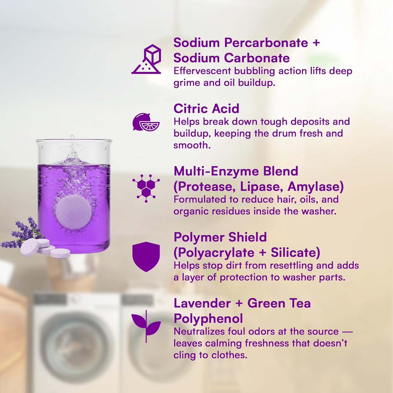 - Dual-Action Cleaner: Our washer machine cleaner tablets use oxygen-release fizzing agents to loosen soap and mineral deposits, while enzymes, lavender and tea extracts target pet grime and odor. Helps keep the washer fresh without harsh chemicals.