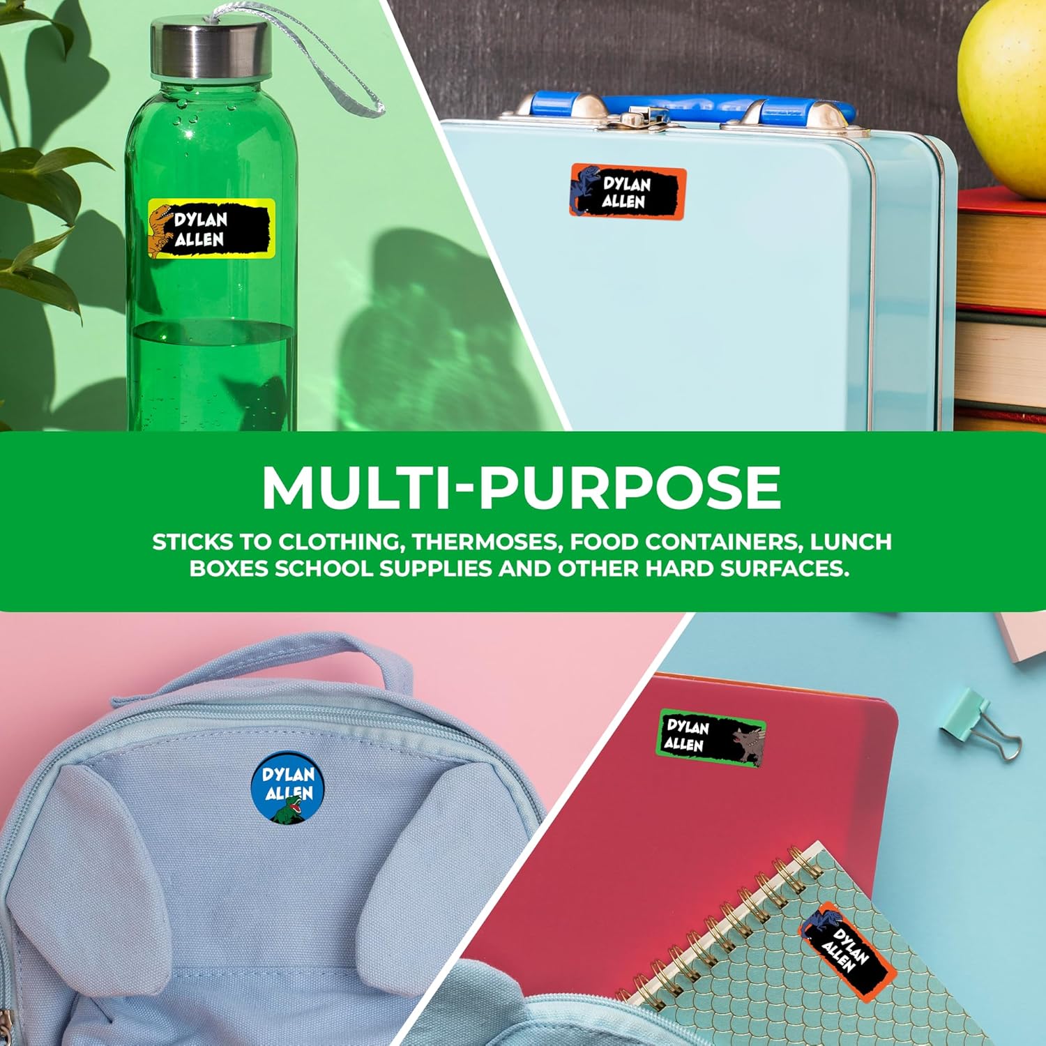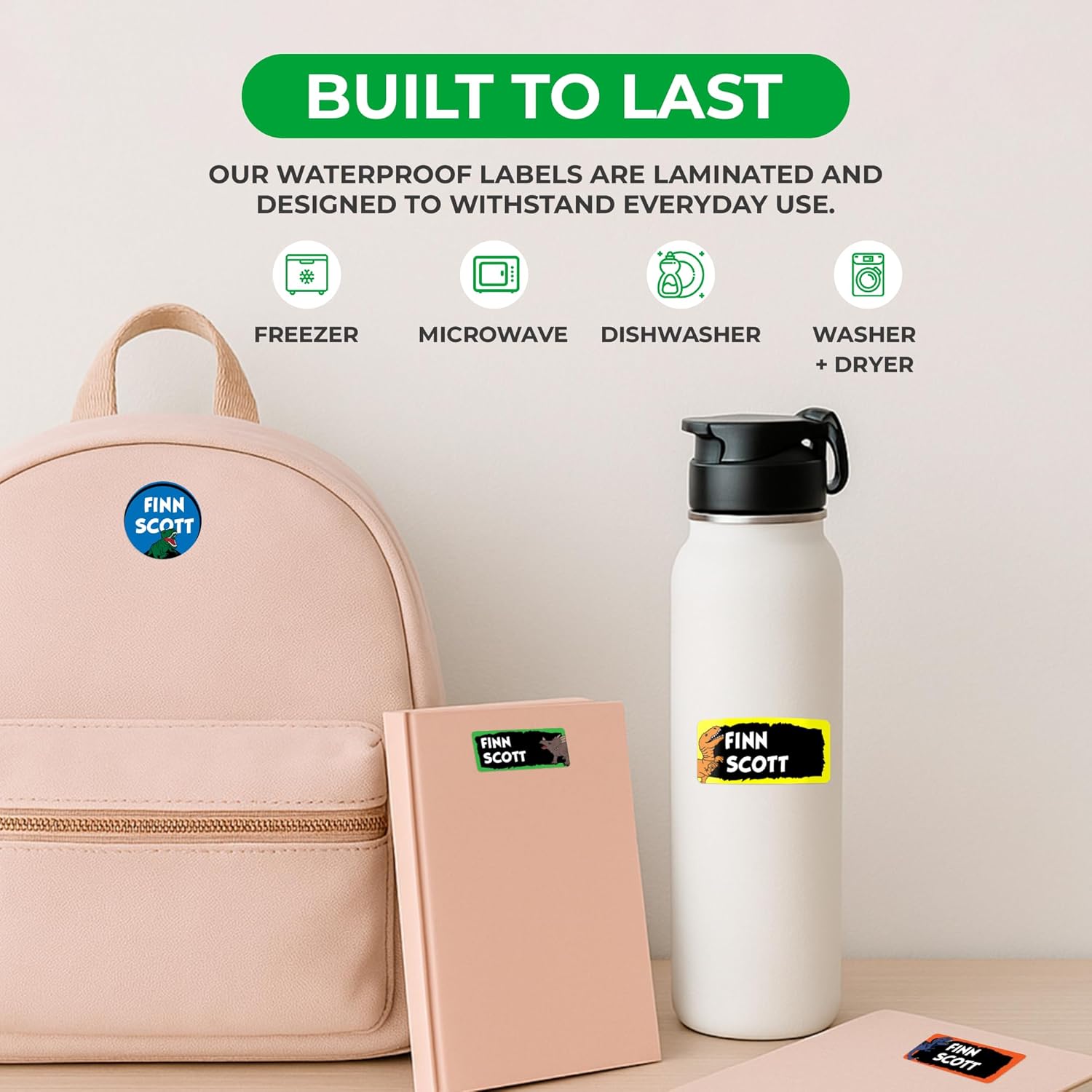 - 💧 Waterproof Stickers & Fade-Resistant — Laminated for long-lasting use, our custom stickers personalized won’t peel, fade, or rub off. Keep your kid’s name visible no matter where the day takes them. These waterproof vinyl labels stick to bottles, lunch boxes, clothing, notebooks, and more. Designed to survive dishwashers, microwaves, freezers, and even washer/dryers!