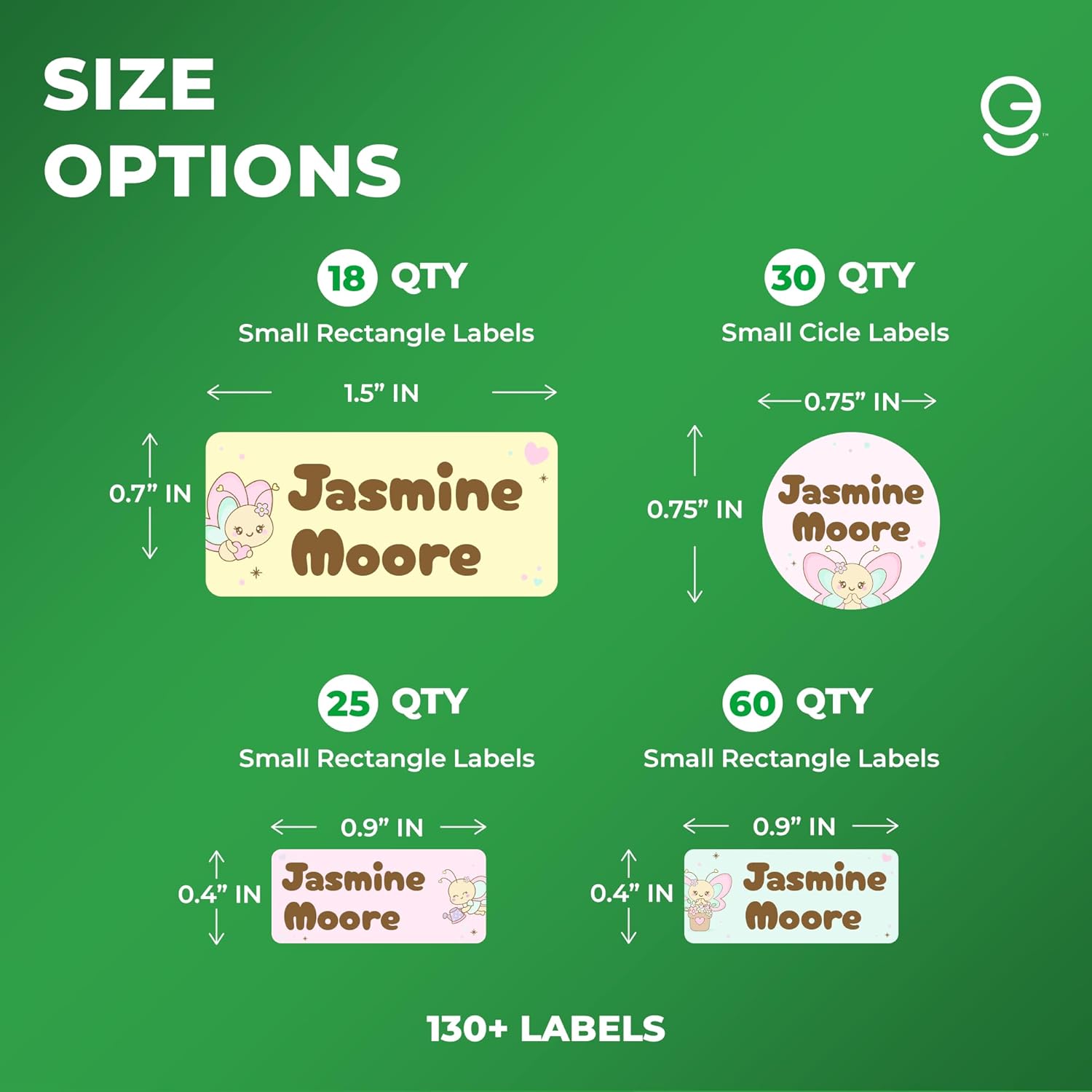 - 📏 Kids Stickers Pack of 130+ with Size Options — This set includes 133 labels in three practical sizes to fit all your child’s essentials: 18 large (1.5" x 0.7"), 30 round (0.75"), and 85 mini (0.9" x 0.4"). Use them on water bottle stickers for kids, books, school supplies for kids, lunch containers, clothing, and more—no item too big or too small!