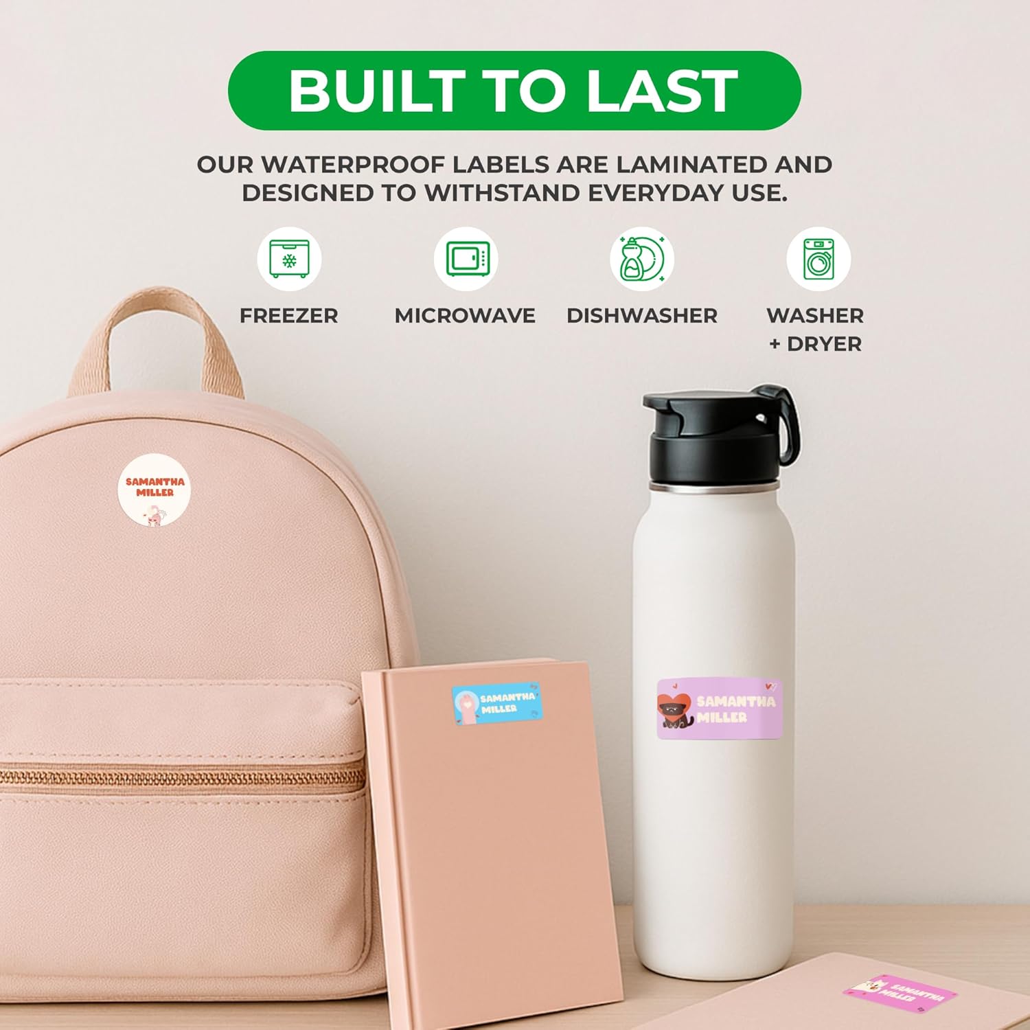 - 💧 Waterproof Stickers & Fade-Resistant — Laminated for long-lasting use, our custom stickers personalized won’t peel, fade, or rub off. Keep your kid’s name visible no matter where the day takes them. These waterproof vinyl labels stick to bottles, lunch boxes, clothing, notebooks, and more. Designed to survive dishwashers, microwaves, freezers, and even washer/dryers!