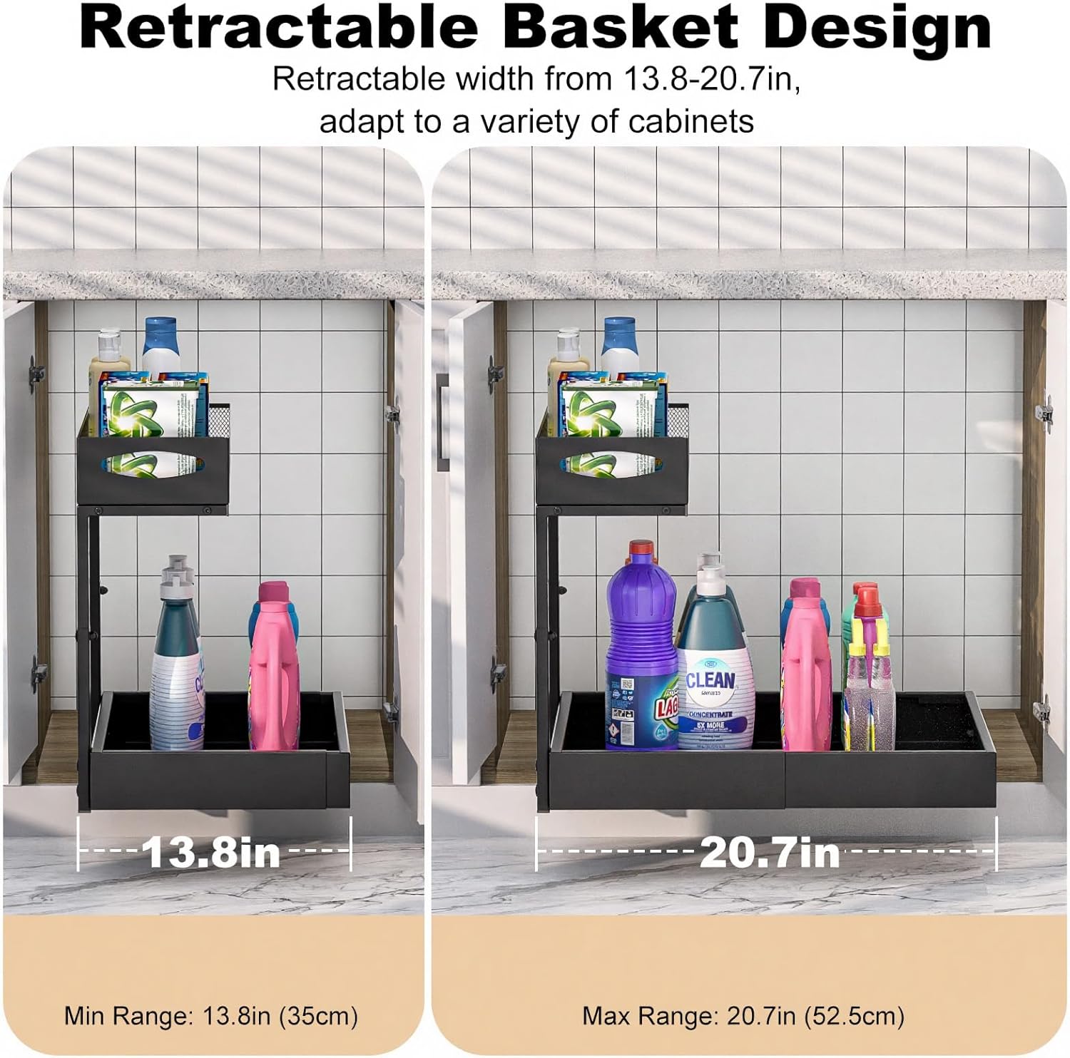 - Pull-Out Basket & Slide Track: The bottom basket features a retractable drawer design expanding from 13.8 inches to 20.7 inches. You can freely set the required width according to the bottom space. Equipped with 3-section smooth glide rails, it slides out fully with a gentle pull, letting you access items at the back without bending