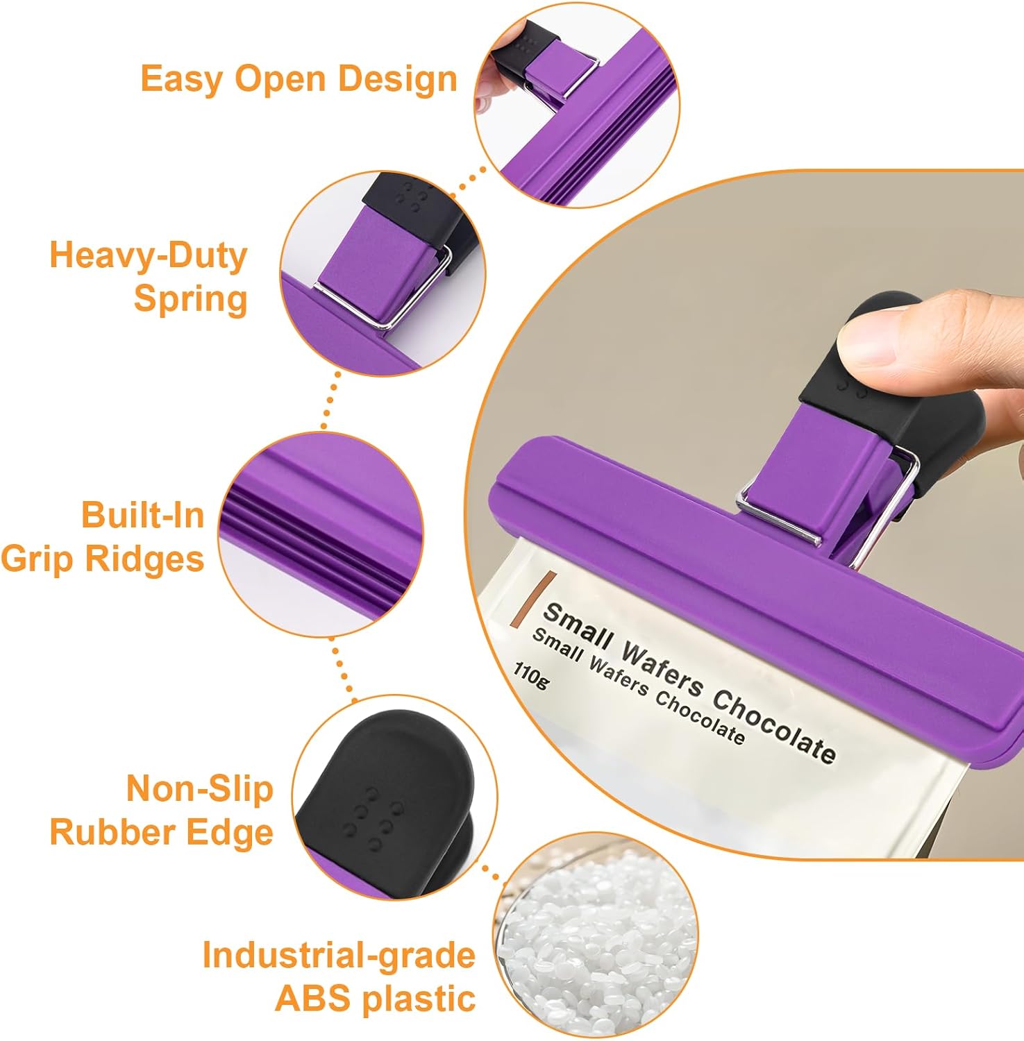 - 【High Quality Material】Food bag clips is made of high quality ABS+TPR+stainless steel material, which is sturdy and long-lasting. Powerful spring tension keeps bags sealed. Rubberized non-slip handle for comfortable grip and easy opening