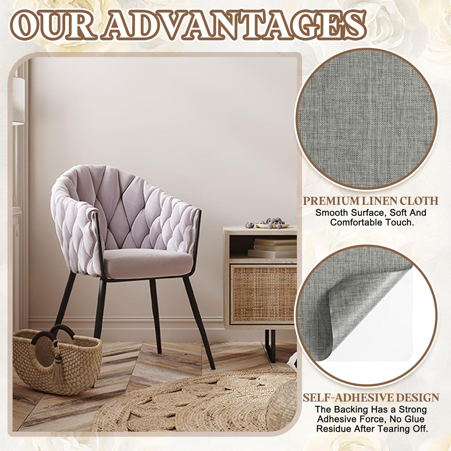- Application: This self-adhesive linen patch is very suitable for various home and car scenes, such as repairing furniture such as sofas, tables and chairs, clothes, backpacks, handbags, car seats, etc. It can be used for various home crafts and decorations, and can also be used for outdoor tents, sails, hammocks, sleeping bags, outdoor furniture covers, luggage bags, etc