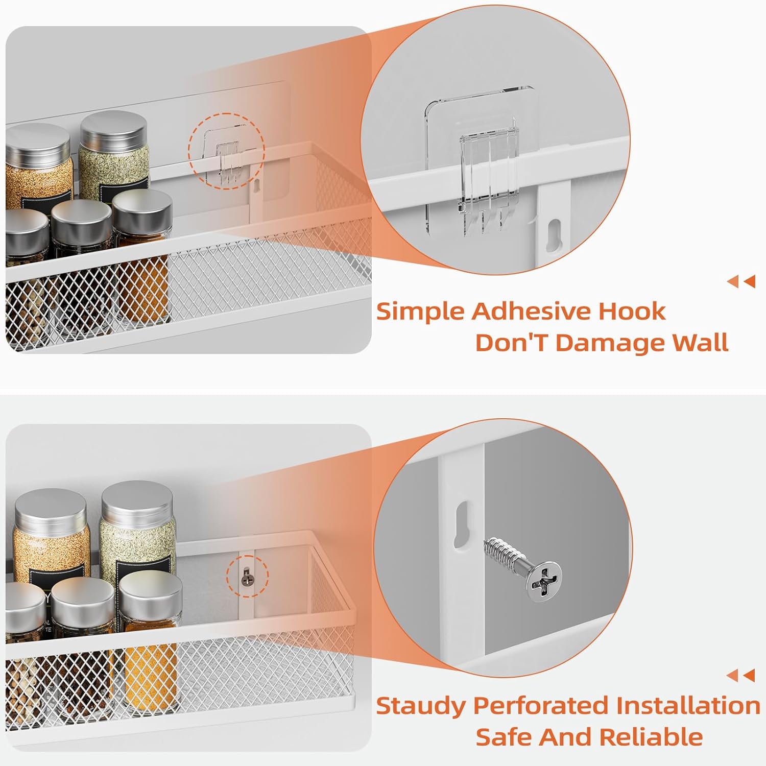 • Premium Metal Material and Stable Storage: The spice rack wall mounted is made of thickened high-strength carbon steel,is waterproof, rustproof, easy to clean.Our spice rack comes with additional 2.36-inch side guards and reinforced adhesive stickers to ensure safety and stability.