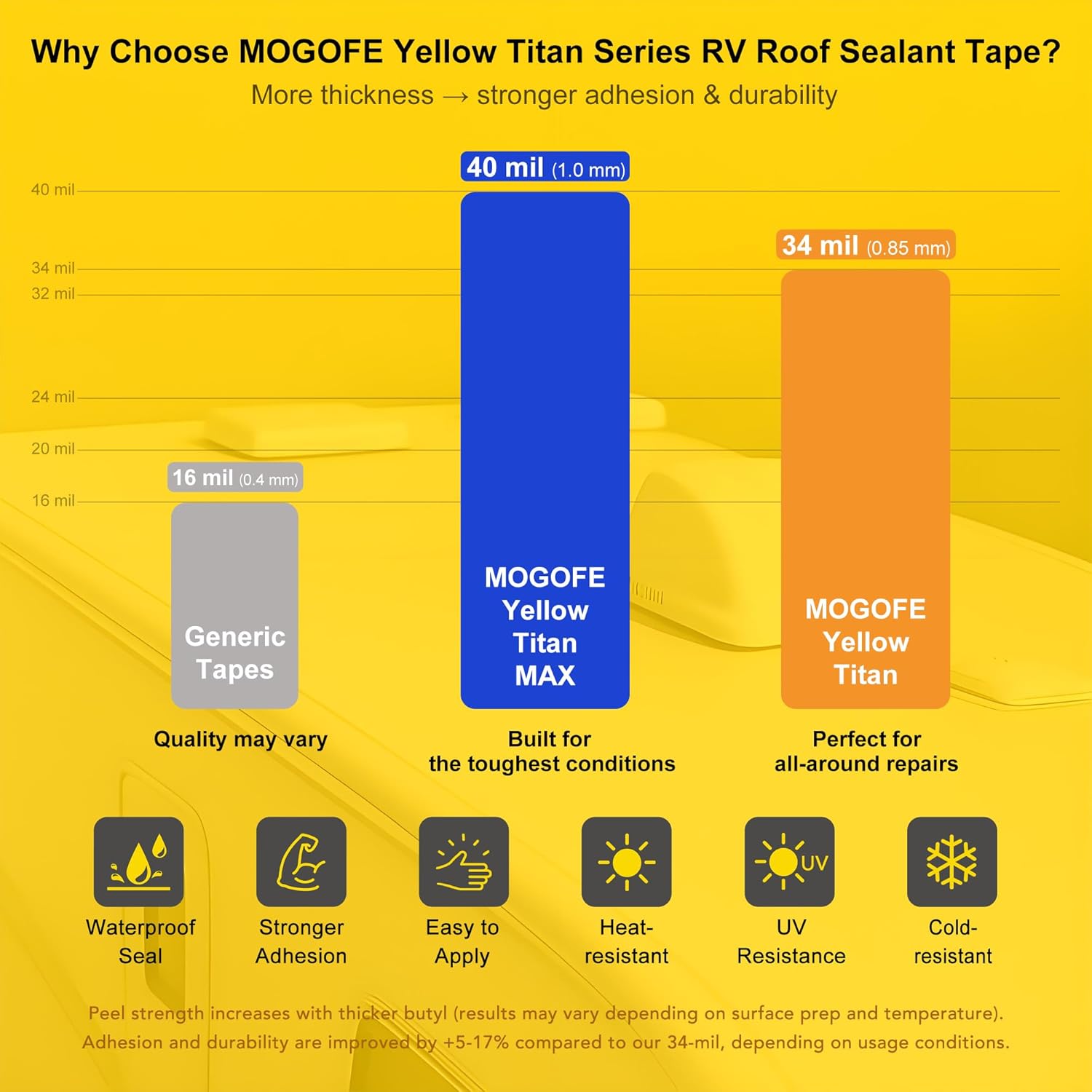 - MAX ADHESIVE STRENGTH β PERMANENT SEAL: Upgraded RV roof tape with Max-strength butyl adhesive, bonds on contact to flat, curved, or corner surfaces for a secure, leak-proof seal that lasts.