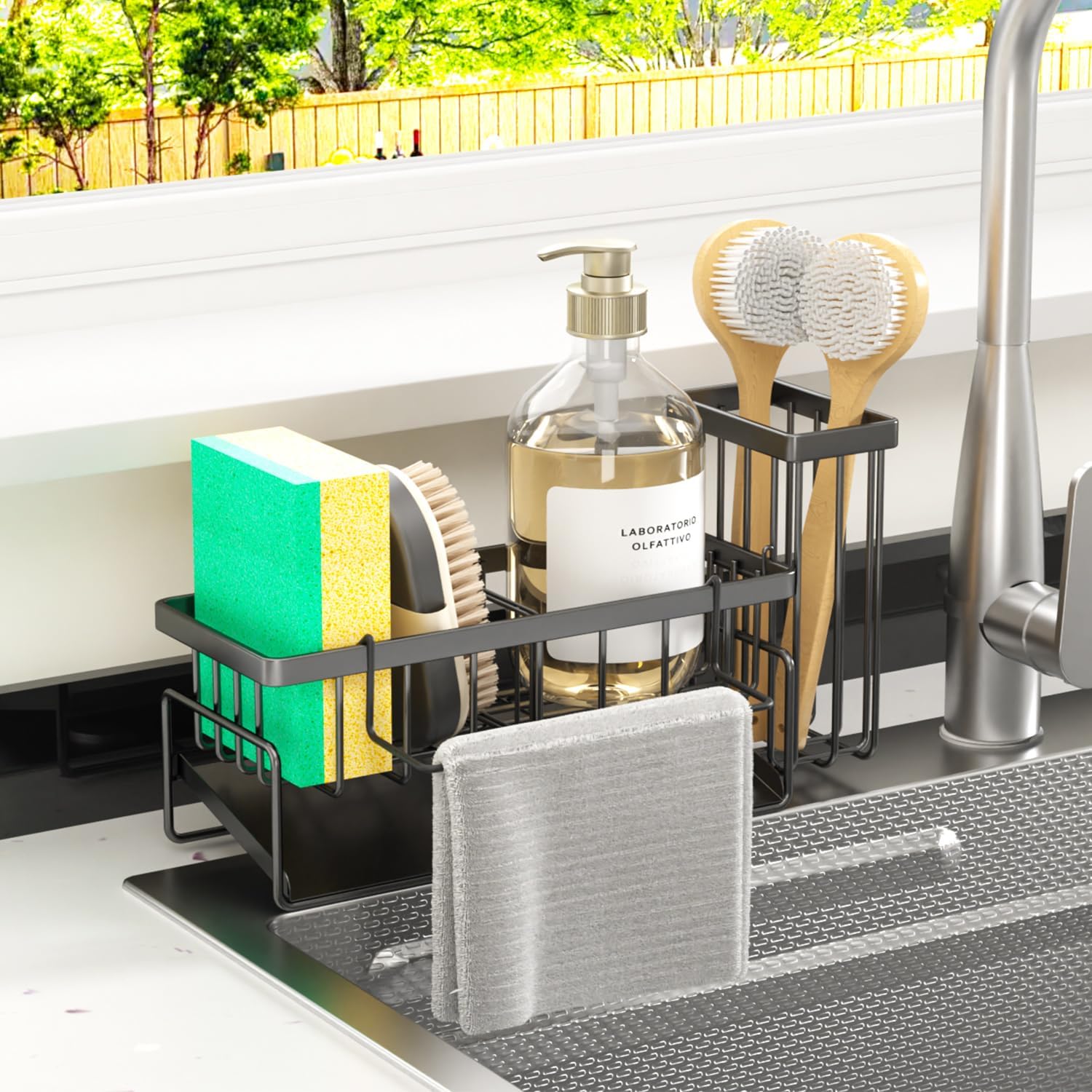 - ăNon-Slip Heavy Duty Sponge Caddy â Wonât Scratch or Move During Use!ăReinforced SUS304 steel frame ensure stability even when scrubbing pots vigorously. Rounded edges protect delicate marble/quartz countertopsfrom scratches, while the rustproof construction survives daily water exposure