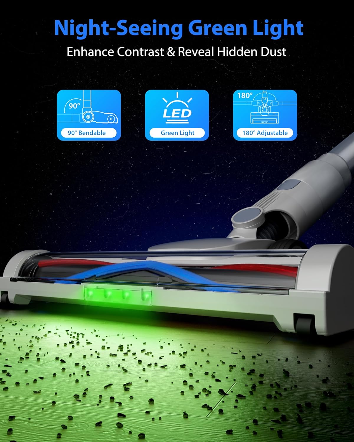 - 𝐒𝐜𝐢𝐞𝐧𝐭𝐢𝐟𝐢𝐜 𝐆𝐫𝐞𝐞𝐧 𝐋𝐢𝐠𝐡𝐭 𝐟𝐨𝐫 𝐂𝐥𝐞𝐚𝐫𝐞𝐫 𝐂𝐥𝐞𝐚𝐧𝐢𝐧𝐠 - The floor brush's 520nm green LED exposes hidden dust while reducing glare. Its adjustable head reaches tight spaces, eliminating furniture-moving hassles.