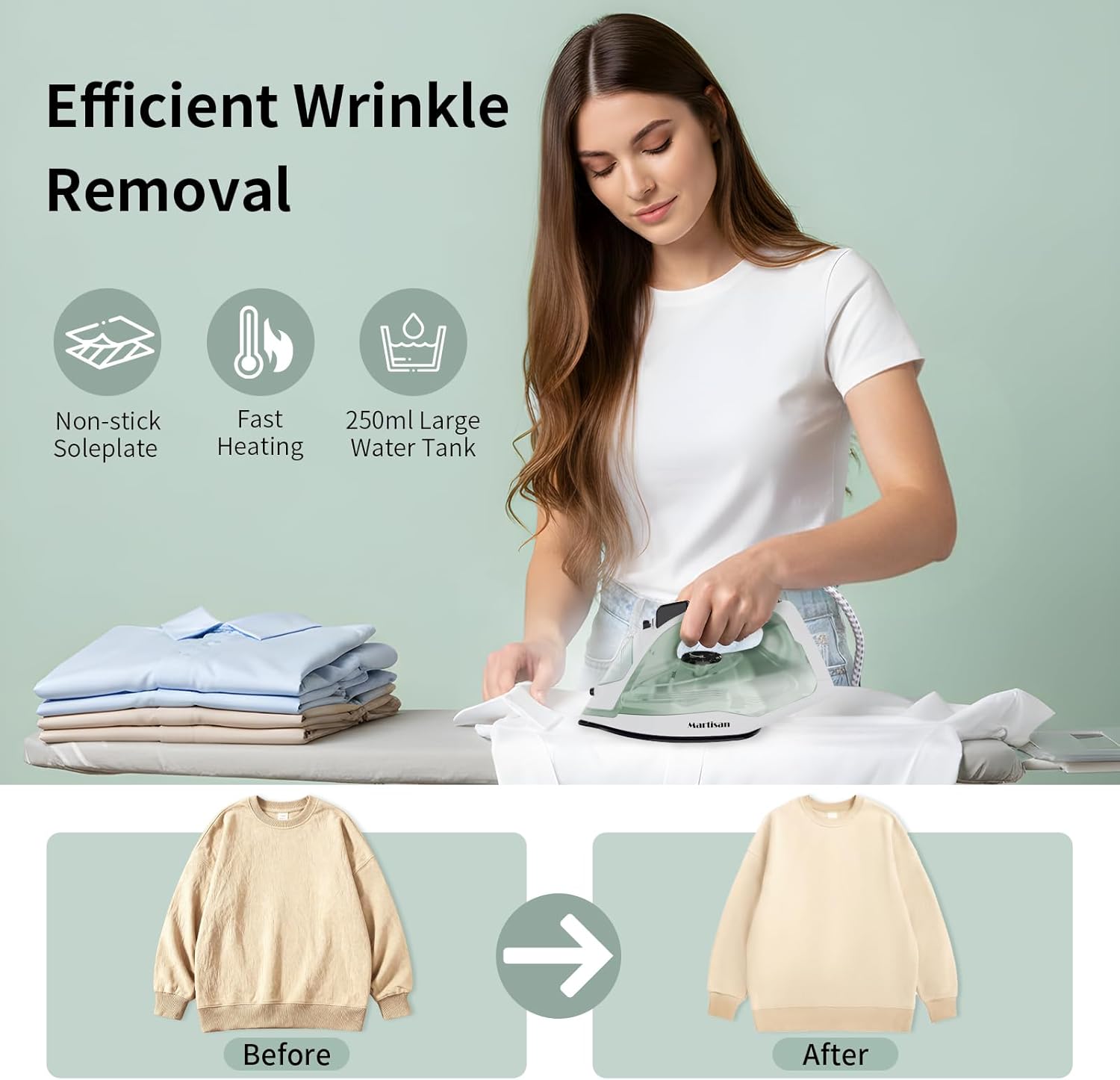 - Quality Certificate & Elegant Design: All Martisan clothing iron shall pass rigorous water testing and quality control system before leaving the factory to ensure they meet international standards. Precision tips on the soleplate can easily break any corners, including buttons/collars/plackets.An ergonomic grip makes your ironing more convenient and comfortable. Some water might remain in the water tank, which is Normal for the pre-tested process.