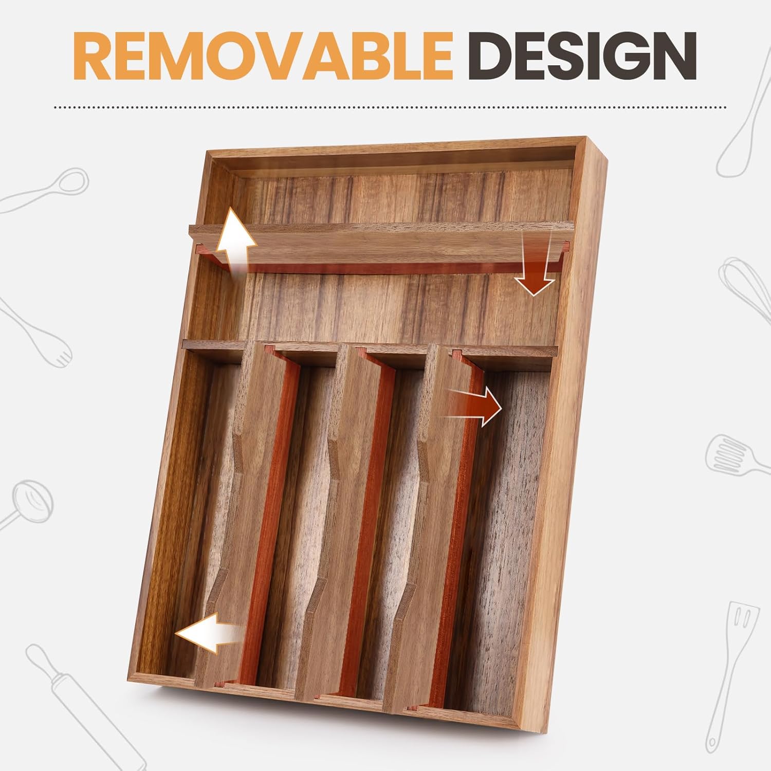 - Detachable Wooden Organization: Our silverware storage rack has 5 detachable wooden partitions. Easily rearrange or remove them to create the perfect compartment for your knives, forks, spoons, cooking tools, and even larger kitchen gadgets. Design a storage solution that perfectly fits your unique drawers and collections
