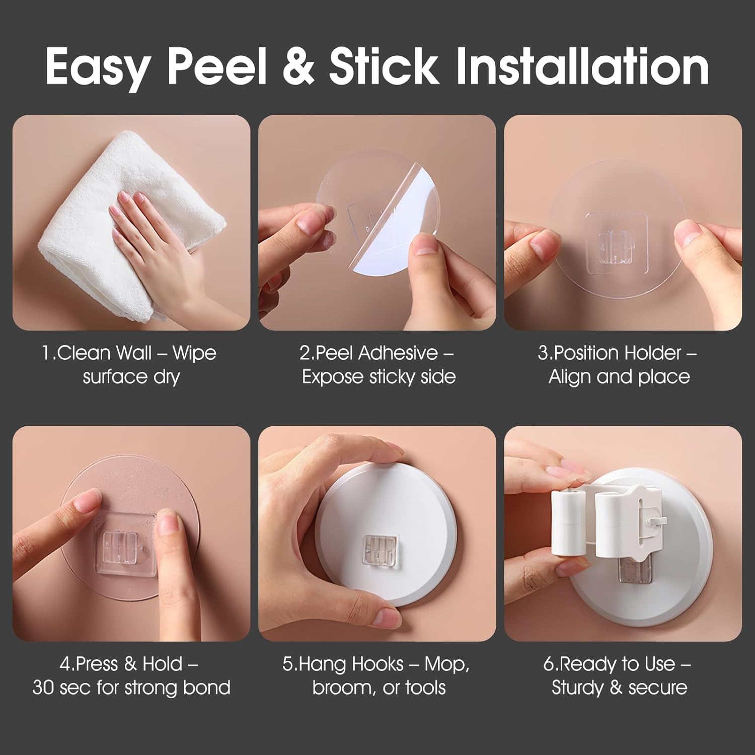 - No Drilling & Easy Installation – Use the self-adhesive backing to mount on walls without making holes. Quick installation in 6 simple steps: clean wall, peel off adhesive, press firmly, and hang mop.