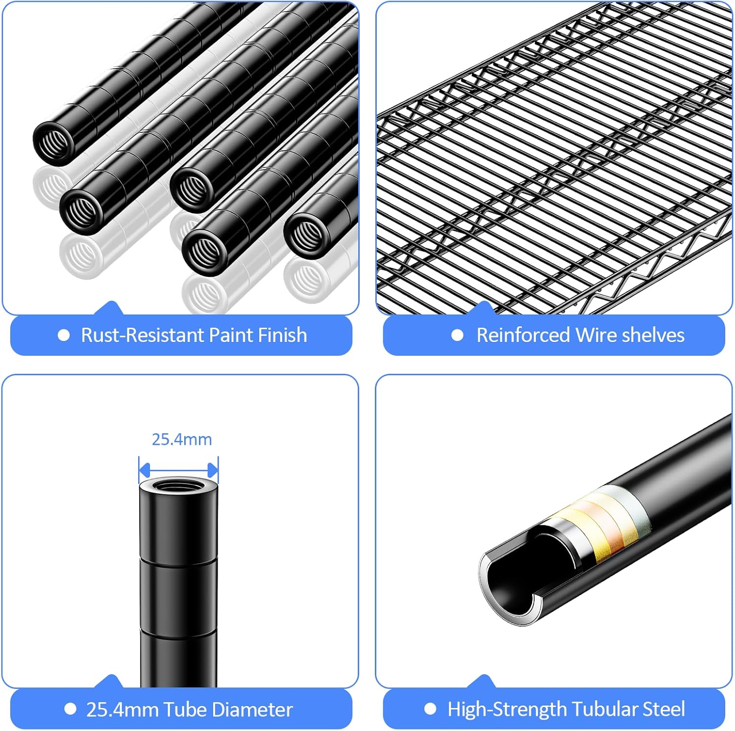 - COMMERCIAL-GRADE HEAVY DUTY β Built with premium carbon steel and 25.4mm thick metal rods, each shelf supports up to 660 lbs on leveling feet, with a total capacity of 2200 lbs (approx. 530 lbs on wheels). Perfect for heavy-duty storage needs.