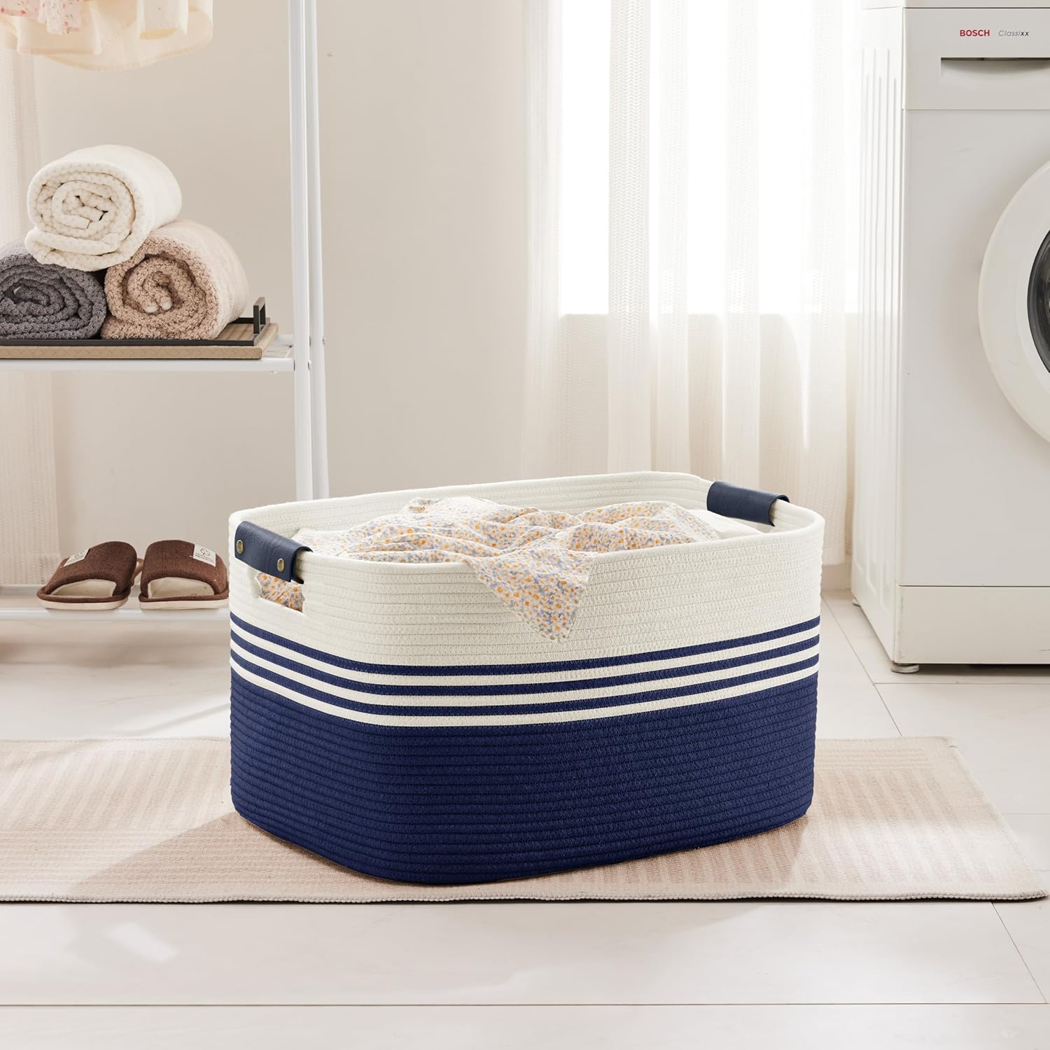 72L Large Laundry Basket with Leather Handles for Living Room Storage, Woven Rope Baskets Bin for Blanket, Kids Toy, Gifts, Wicker Hamper for Bedroom Dirty Clothes, 22"x17"x12" White Navy