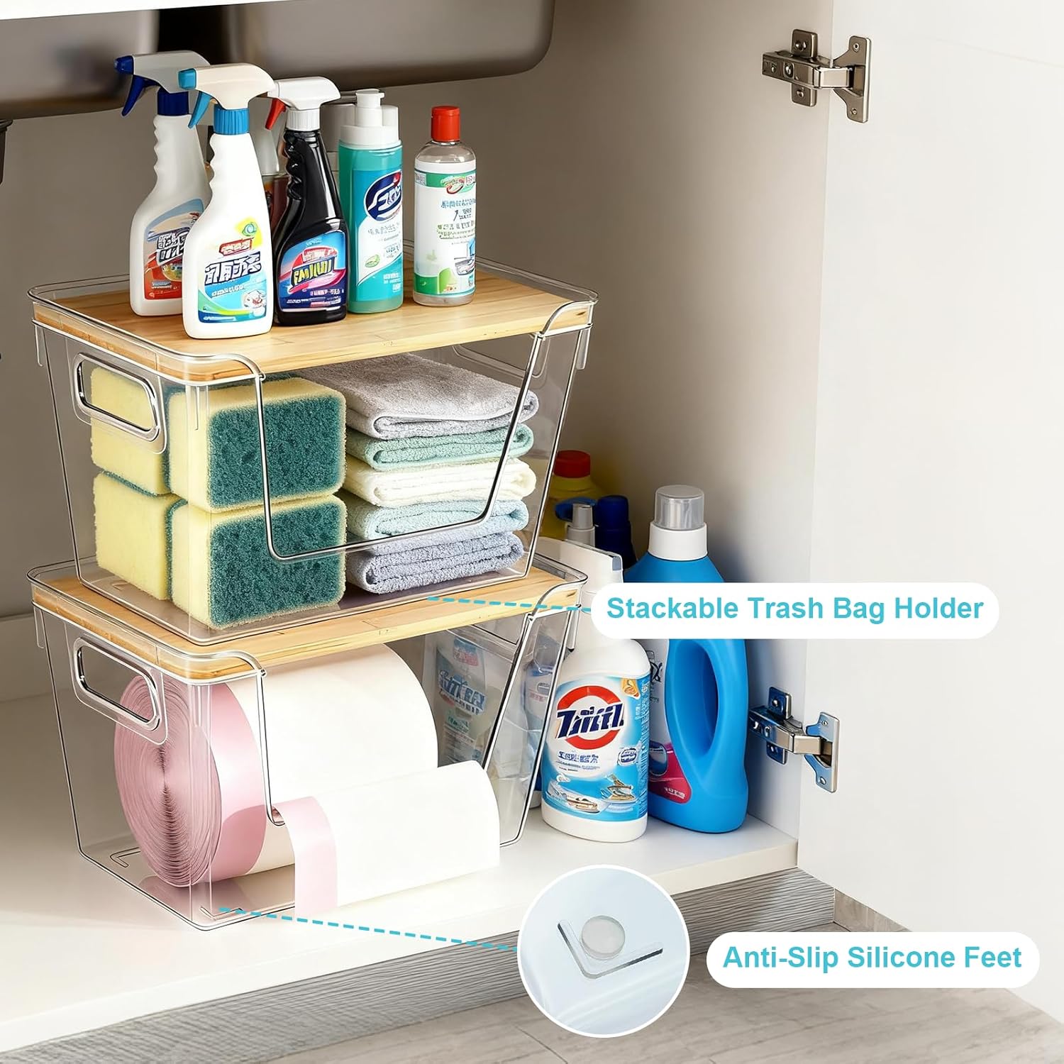 Stackable Trash Bag Dispenser with Bamboo Lid 2 Pack Clear Plastic Garbage Bag Holder, Potato Onion Storage, Kitchen Organizer for Countertop, Under Sink, Pantry
