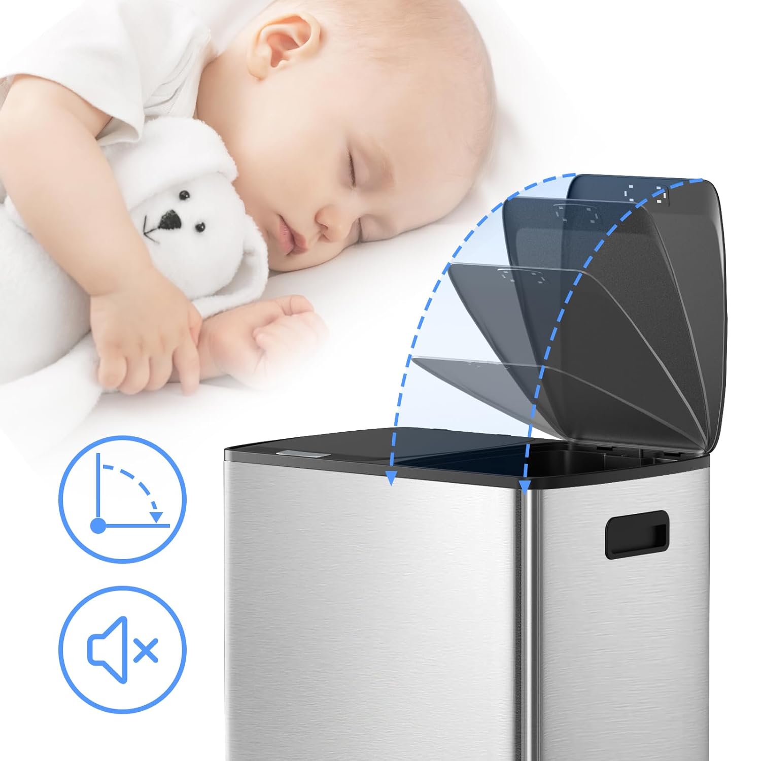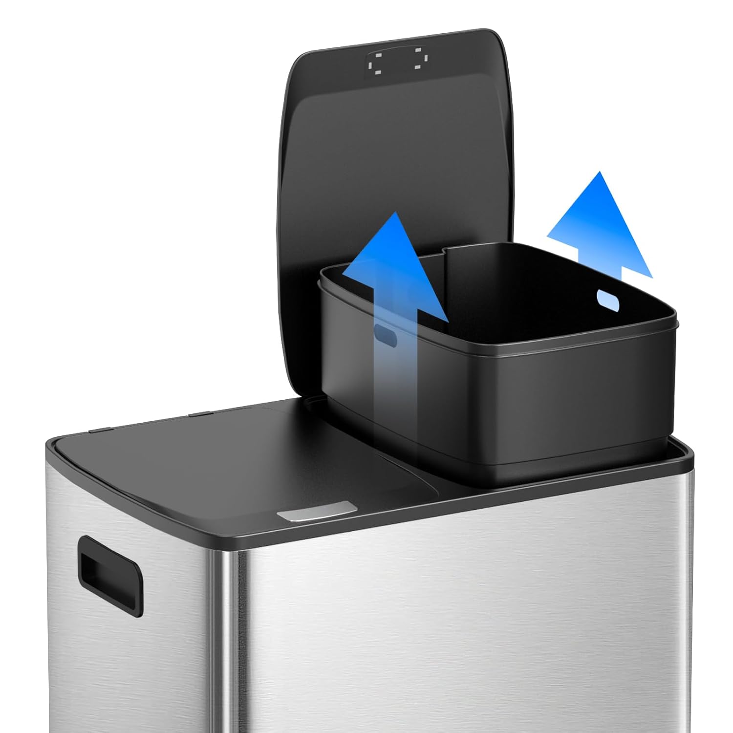 - EASY CARE: This kitchen trash can features a sturdy stainless steel body designed for long-lasting use. Its durable, fingerprint-proof finish keeps it looking clean. Two interior liner bucket is made of durable plastic and can be easily rinsed with mild soap and water.